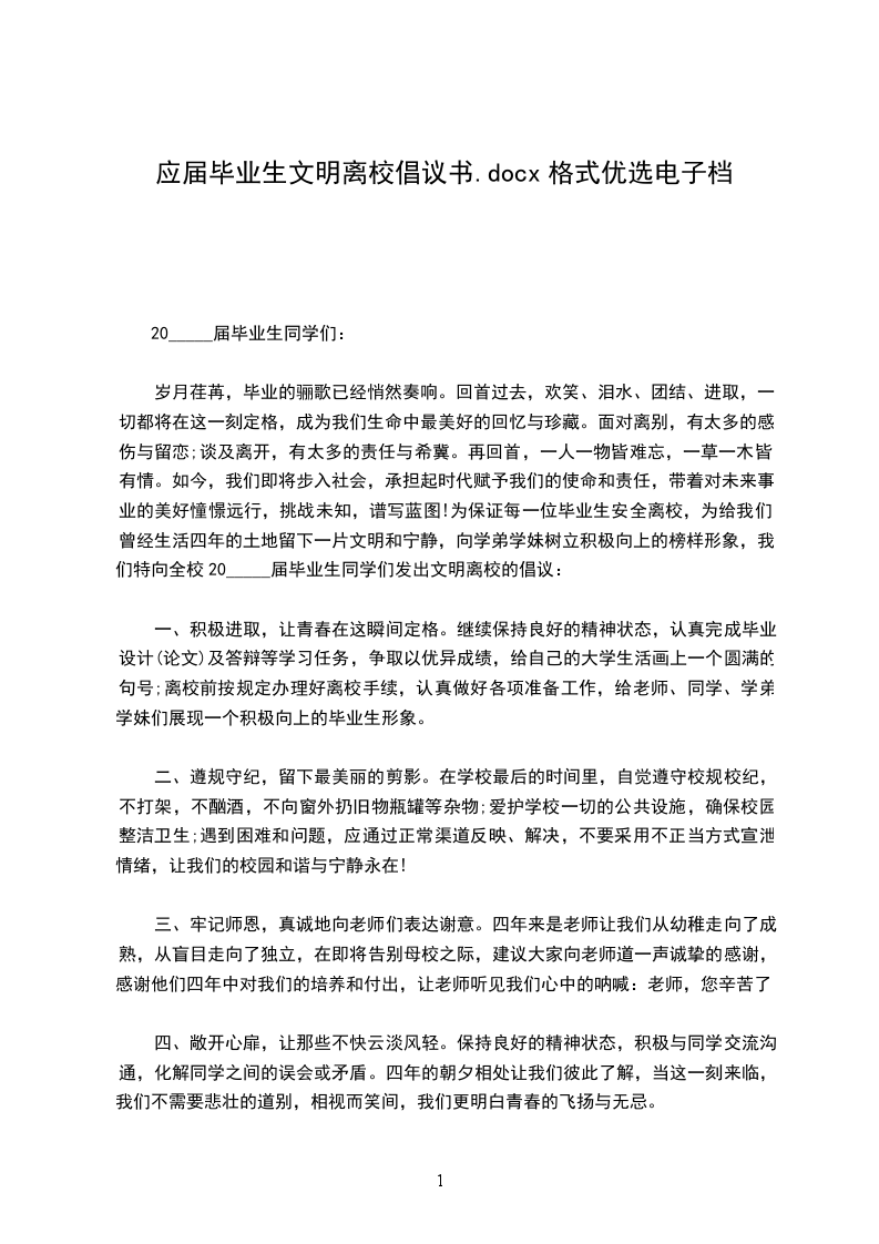 岁月荏苒,毕业的骊歌已经悄然奏响。回首过去,欢笑、泪水、团结、进取,一切都将在这一刻定格,成为我们生命中最美好的回忆与珍藏。面对离别,有太多的感伤与留恋;谈及离开,有太多的责任与希冀。再回首,一人一物皆难忘,一草一木皆有情。如今,我们即将步入社会,承担起时代赋予我们的使命和责任,带着对未来事业的美好憧憬远行,挑战未知,谱写蓝图!为保证每一位毕业生安全离校,为给我们曾经生活四年的土地留下一片文明和宁静,向学弟学妹树立积极向上的榜样形象,我们特向全校20_____届毕业生同学们发出文明离校的倡议: