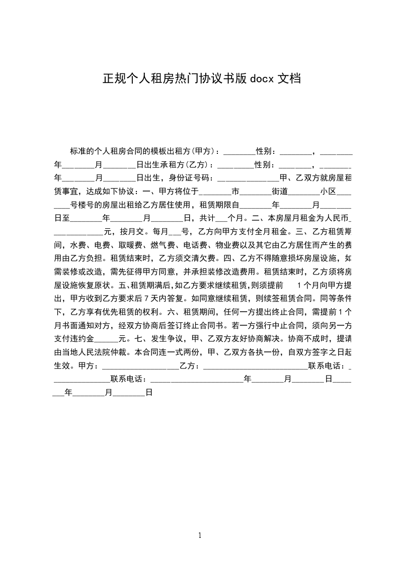 标准的个人租房合同的模板