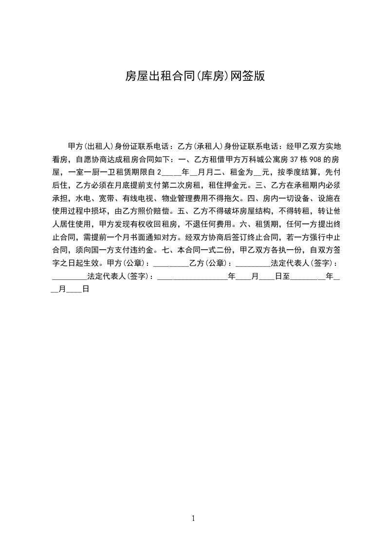 一、乙方租借甲方万科城公寓房37栋908的房屋,一室一厨一卫租赁期限自2_____年__月月