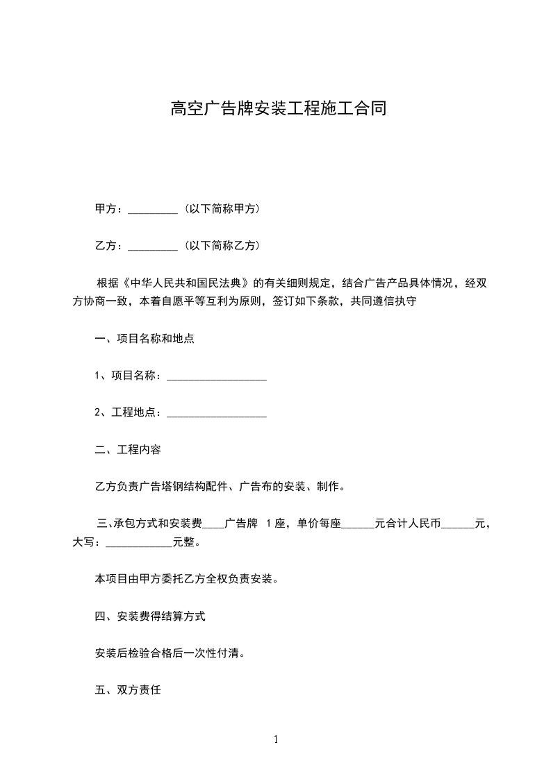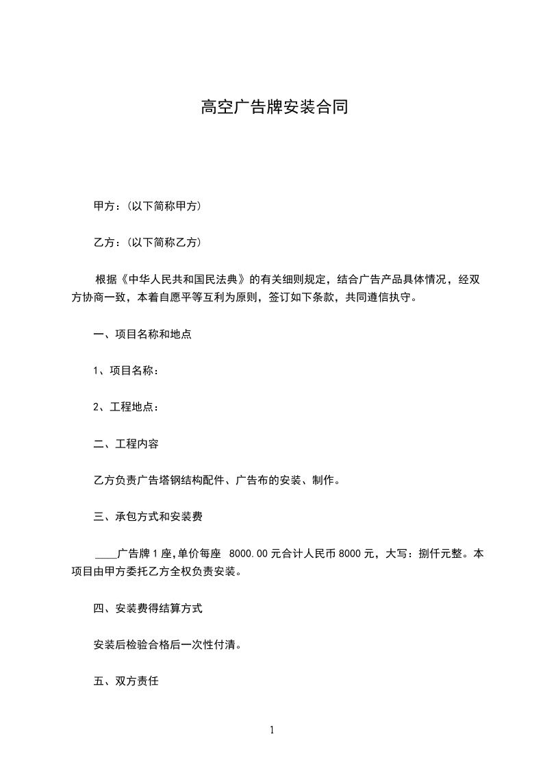 ____广告牌1座,单价每座8000.00元合计人民币8000元,大写:捌仟元整。本项目由甲方委托乙方全权负责安装。