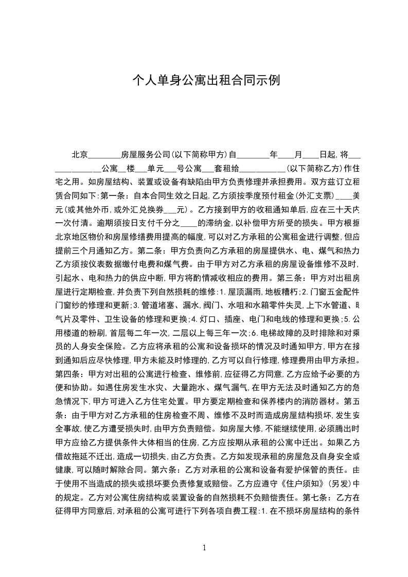 北京________房屋服务公司(以下简称甲方)自________年____月____日起,将______________公寓__楼___单元___号公寓___套租给___________(以下简称乙方)作住宅之用。如房屋结构、装置或设备有缺陷由甲方负责修理并承担费用。