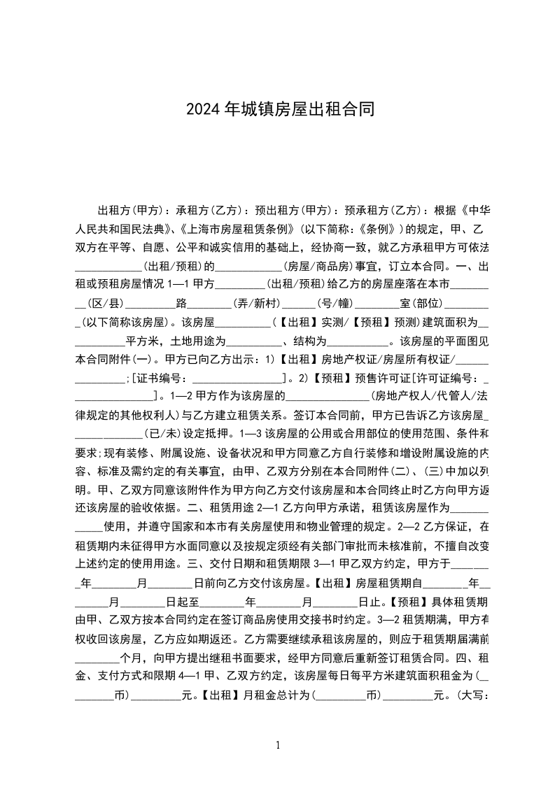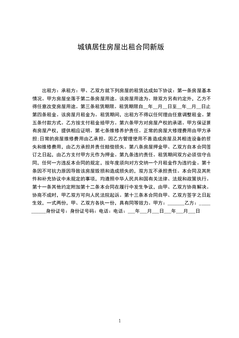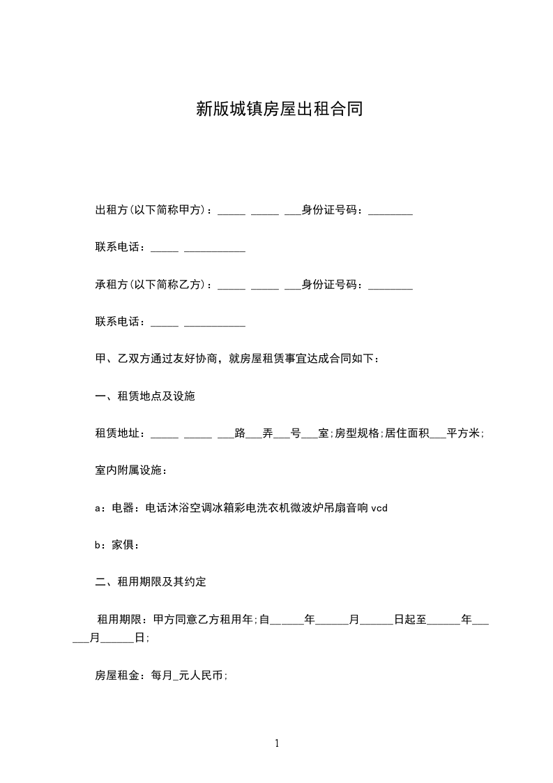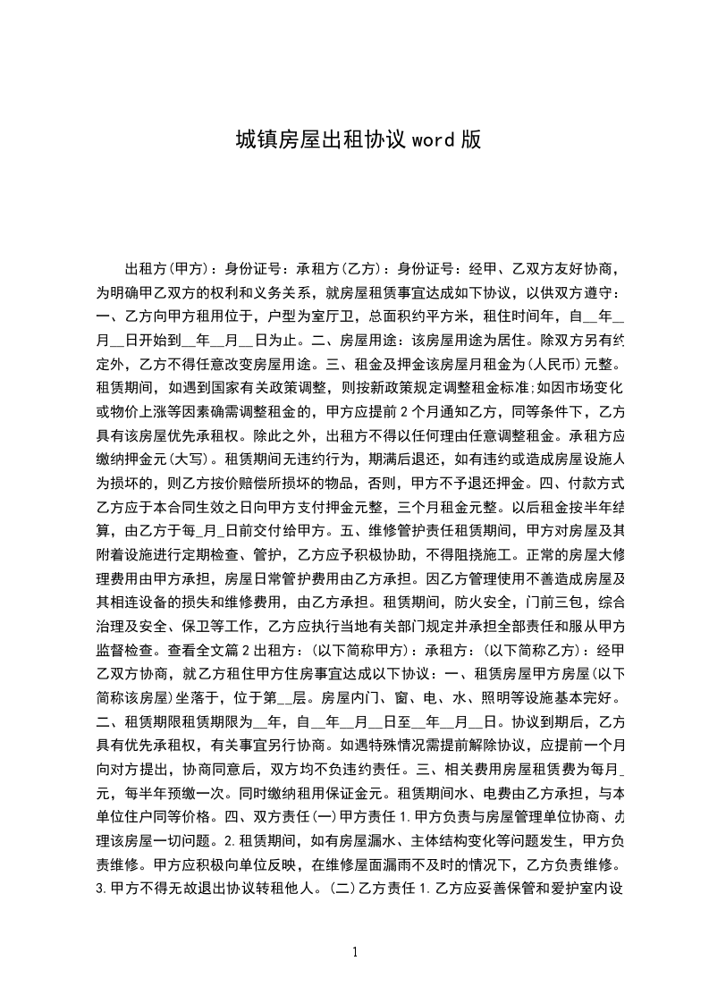 一、甲方将位于_________市_________街道_________小区_________号楼_________号的房屋出租给乙方居住使用,租赁期限自_________年_________月_________日至_________年_________月_________日,计_________个月。