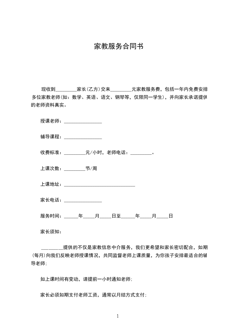 现收到_________家长(乙方)交来_________元家教服务费,包括一年内免费安排多位家教老师(如:数学、英语、语文、钢琴等,仅限同一学生),并向家长承诺提供的老师资料真实。