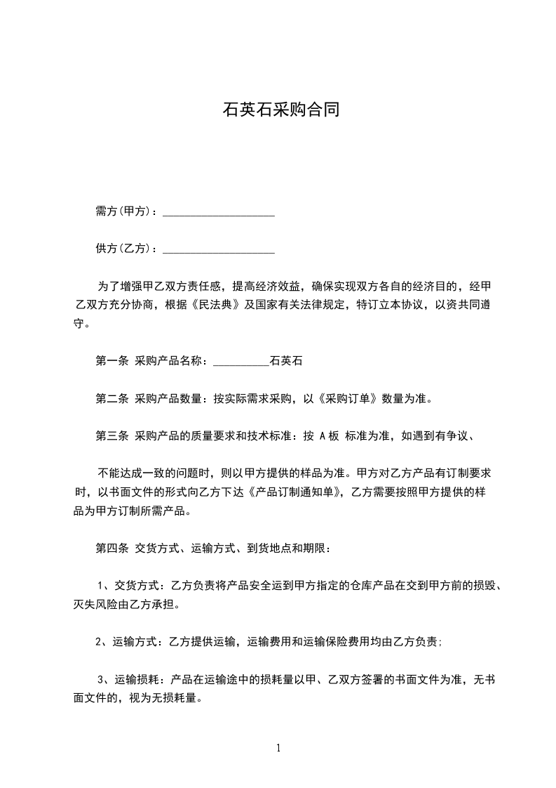 第一条 采购产品名称:__________石英石