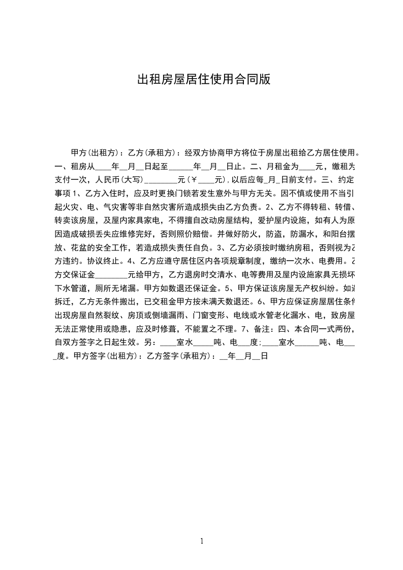 7.甲方有以下行为之一的,乙方有权解除合同:_________________(1)不能提供房屋或所提供房屋不符合约定条件,严重影响居住。(2)甲方未尽房屋修缮义务,严重影响居住的。