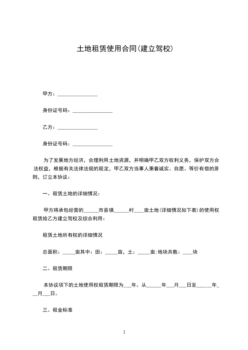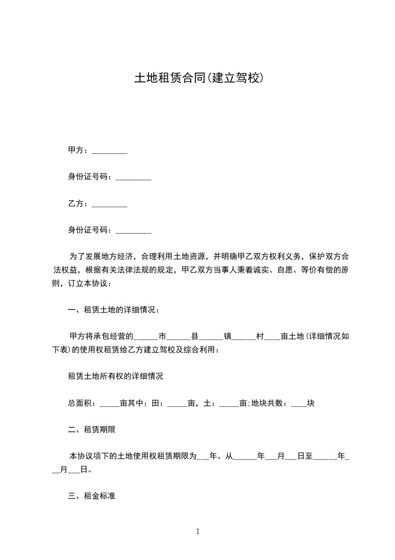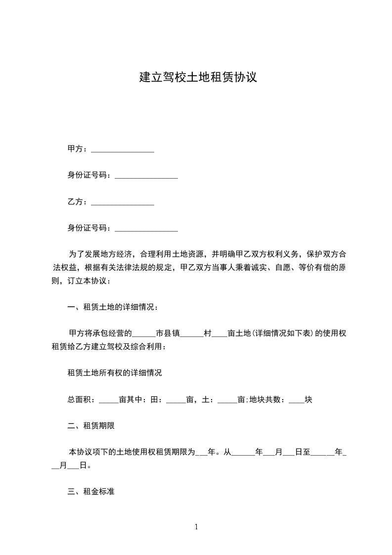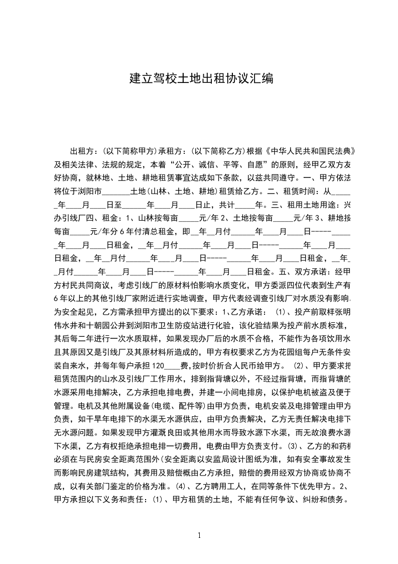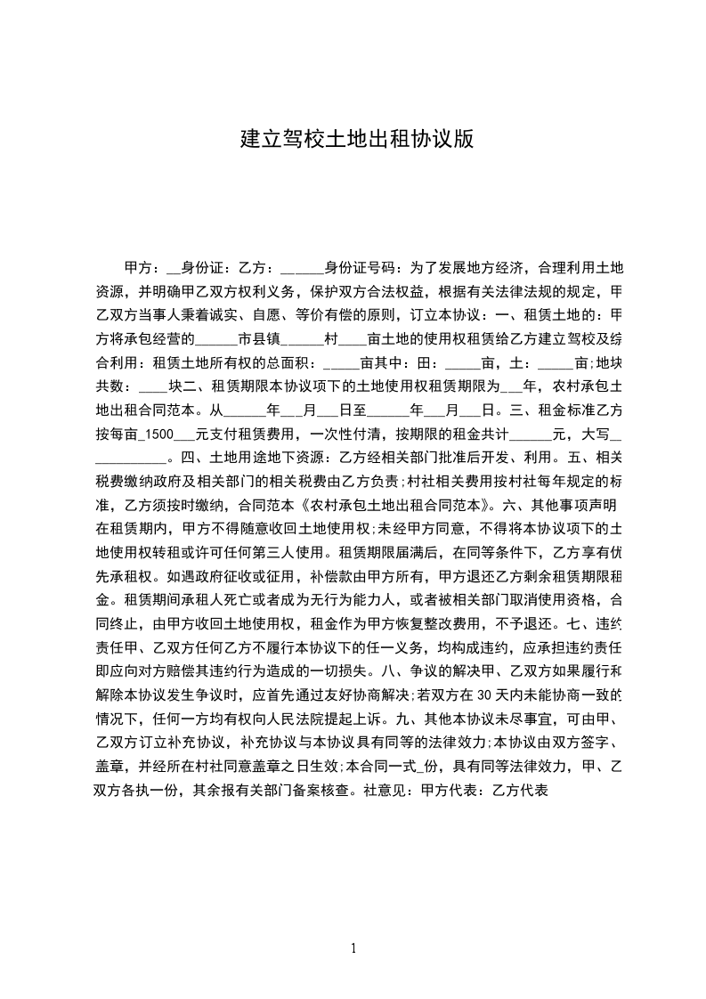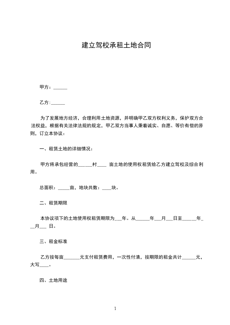 甲方将承包经营的______市县镇______村____亩土地的使用权租赁给乙方建立驾校及综合利用: