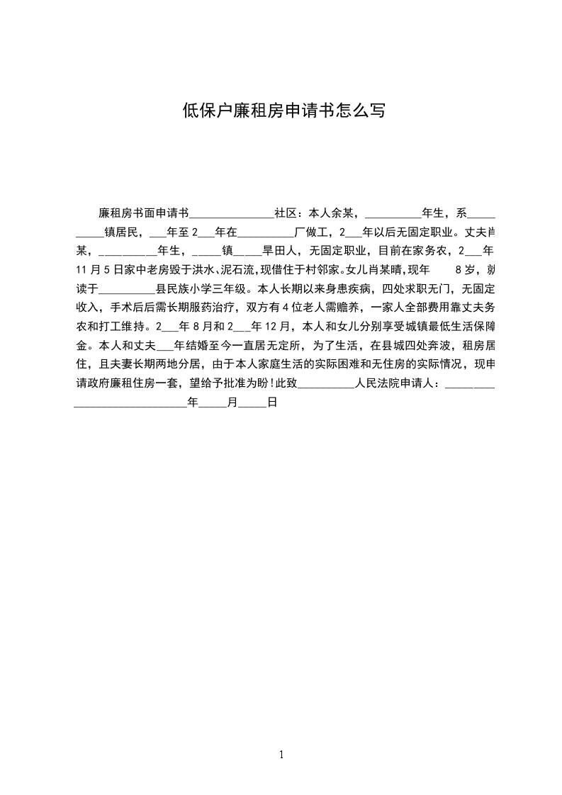 我叫___,男,退休职工,家中现有老少6口人。我于2___年从退休,每月只领退休金近1000元;妻子也已50岁,没有经济来源;儿子是待岗工人,每月只领工资1000元左右;儿媳失业在家,没有经济来源;孙还在校读书。家庭每月虽然有一定的工资收入,但由于我和爱人两人均长期患有严重的“三高”疾病,需要坚持每天服用药物,花费很大;加上家庭日常开支和教育等支出,至今无积蓄,经济十分困苦,根本没有能力购买商品房。建县以来,一直只能借用原办公楼居住,一家人挤在两间狭小的房间内,生活十分不便。安居是当前我最为迫切的愿望,但随着近几年来房价的节节攀升,“居者有其屋”梦想的实现更显得遥遥无期。加之原办公楼已被县国资局接管,随时都有可能被告知搬迁,届时真可能会沦落到居无定所的地步。为此,特向有关领导提出申请,请领导能视我家庭困苦,无住房以及我和爱人年老的实际情况,给予特殊照顾一套廉租房,以解决我家人的“住房难”问题,圆我家人住房梦!您的支持照顾,我和家人将永远铭记!顺祝身体健康,工作顺利,家庭幸福!