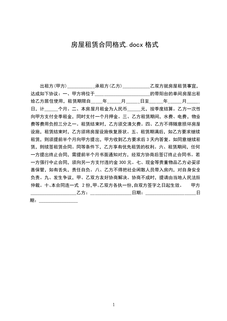 第三条租金:该房屋租金为(人民币大写)___万___千___百拾___元整。令交押金元整(押金在租赁期满无违反合同内容应退还给乙方)