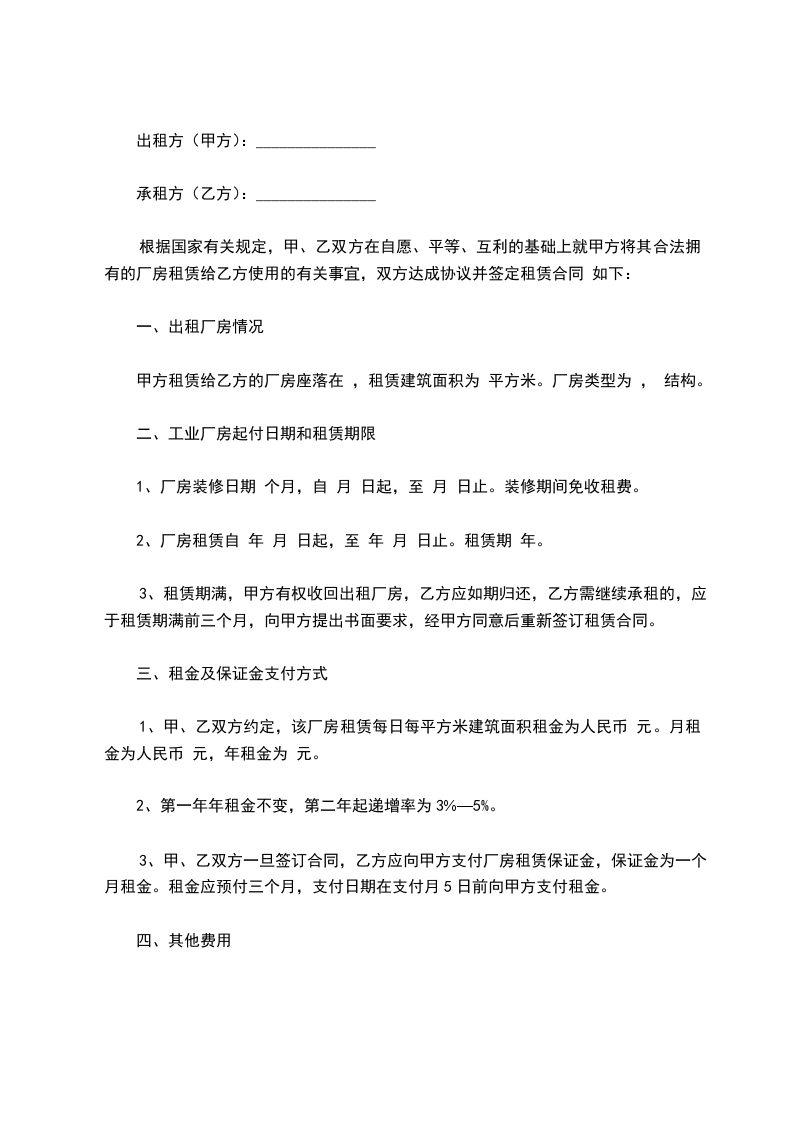 二、乙方租用该厂房期限为三年,即自____年___月__日至____年___月__日止。前30天为装修期,装修期内甲方免收租金。正式起租时间为____年___月__日。