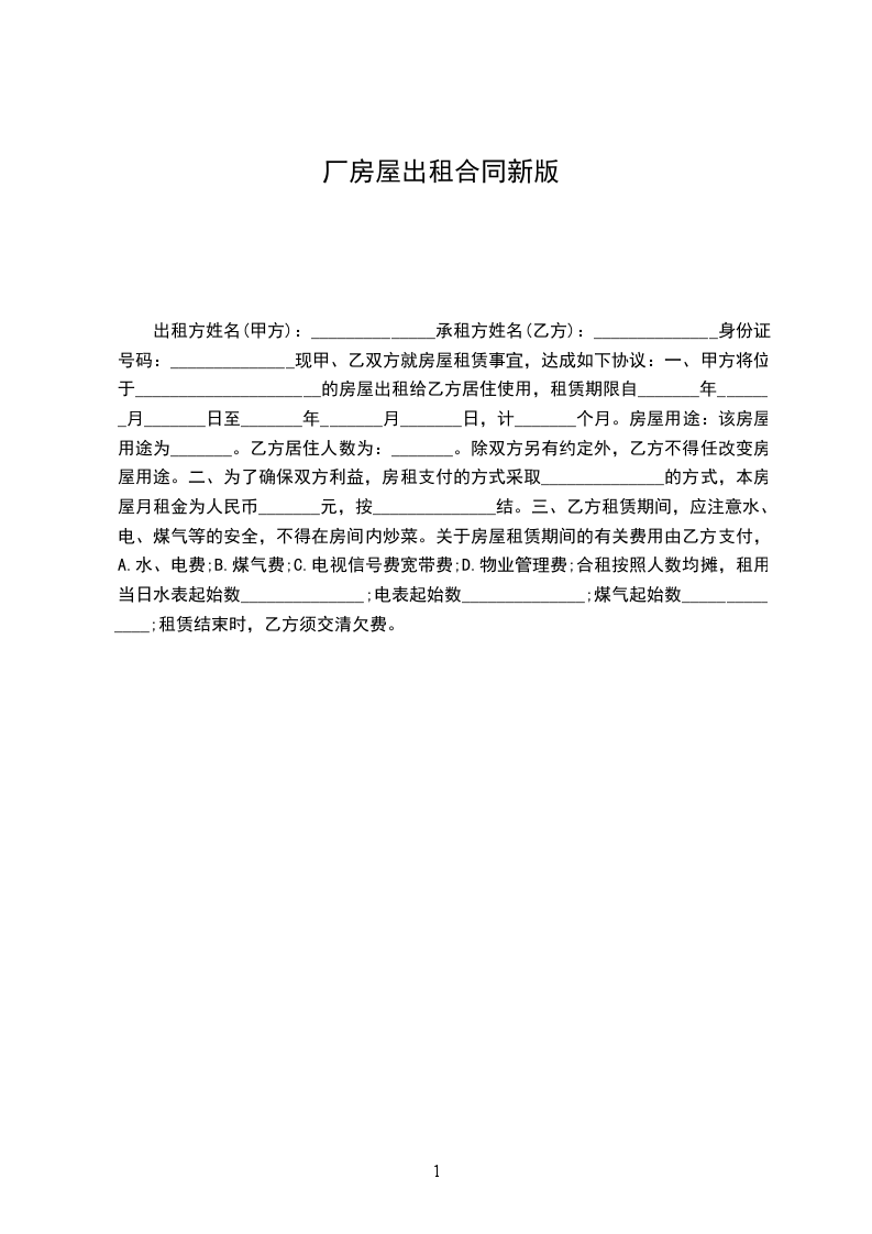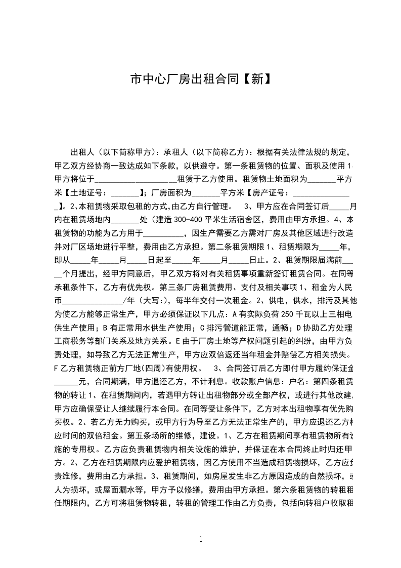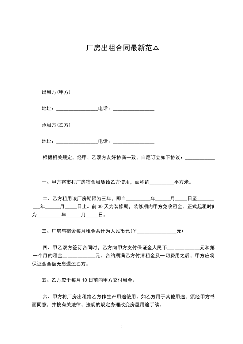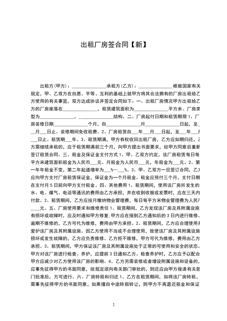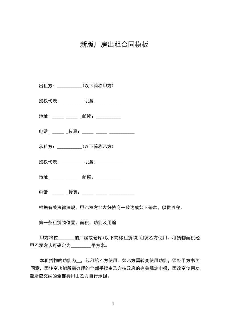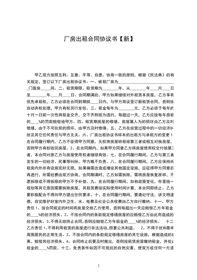 甲乙双方按照互利、互惠、平等、自愿、协商一致的原则,根据《民法典》的有关规定,签订以下厂房出租协议书:
