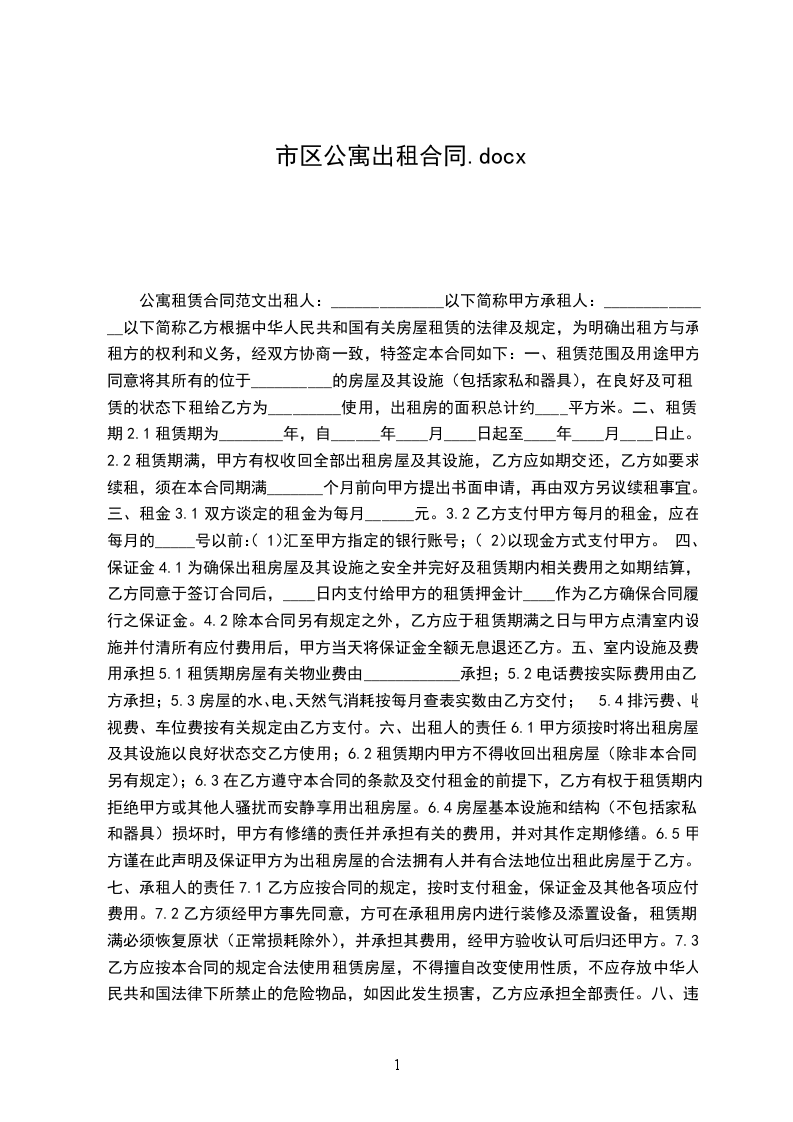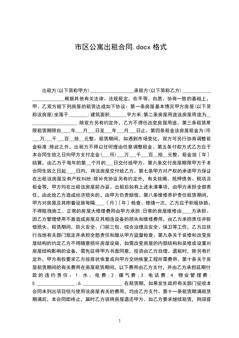 北京________房屋服务公司(以下简称甲方)自________年____月____日起,将______________公寓__楼___单元___号公寓___套租给___________(以下简称乙方)作住宅之用。如房屋结构、装置或设备有缺陷由甲方负责修理并承担费用。