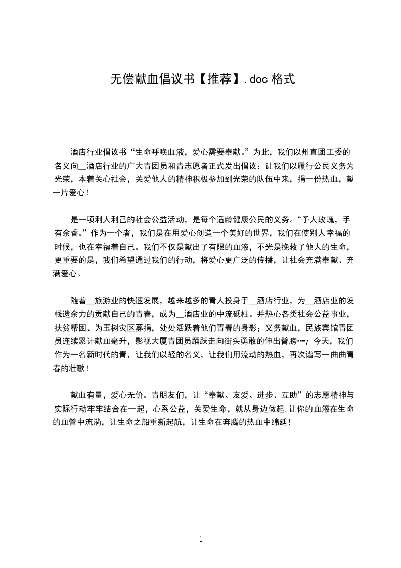 酒店行业倡议书“生命呼唤血液,爱心需要奉献。”为此,我们以州直团工委的名义向__酒店行业的广大青团员和青志愿者正式发出倡议:让我们以履行公民义务为光荣,本着关心社会,关爱他人的精神积极参加到光荣的队伍中来,捐一份热血,献一片爱心!