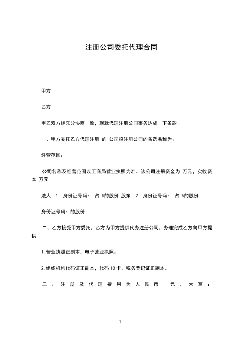 二、乙方接受甲方委托,乙方为甲方提供代办注册公司,办理完成乙方向甲方提供