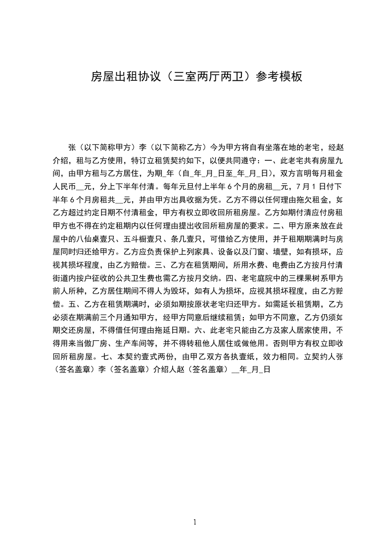 一、此老宅共有房屋九间,由甲方租与乙方居住,为期_年(自_年_月_日至_年_月_日),双方言明每月租金人民币__元,分上下半年付清。每年元旦付上半年6个月的房租__元,7月1日付下半年6个月房租共__元,并由甲方出具收据为凭。乙方不得以任何理由拖欠租金,如乙方超过约定日期不付清租金,甲方有权立即收回所租房屋。乙方如期付清应付房租,甲方也不得在约定租期内以任何理由提出收回所租房屋的要求。