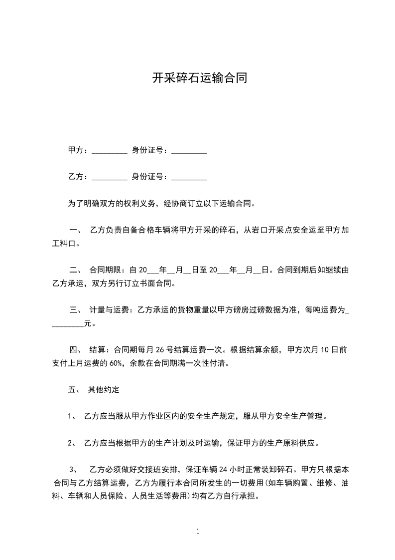 一、 乙方负责自备合格车辆将甲方开采的碎石,从岩口开采点安全运至甲方加工料口。
