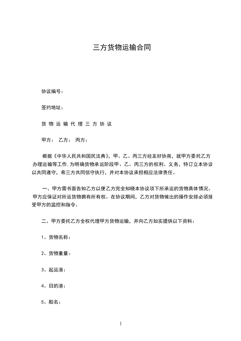 根据《中华人民共和国民法典》,甲、乙、丙三方经友好协商,就甲方委托乙方办理运输等工作,为明确货物承运阶段甲、乙、丙三方的权利、义务,特订立本协议以共同遵守,希三方共同信守执行,并对本协议承担相应法律责任。
