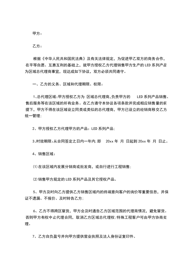 根据《中华人民共和国民法典》及有关法律规定,为促进甲乙双方的商务合作,在平等自愿、互惠互利的基础上,就甲方授权乙方代理销售甲方生产的LED系列产品为区域总代理商事宜,现达成如下协议,双方必须共同遵守。
