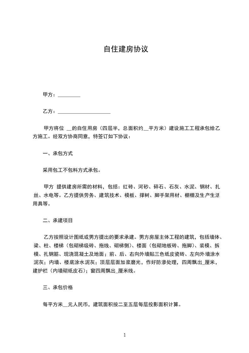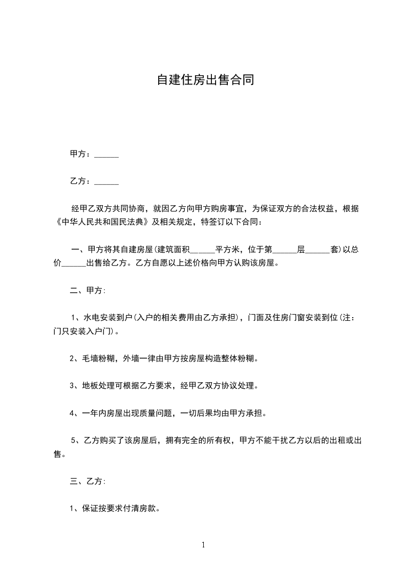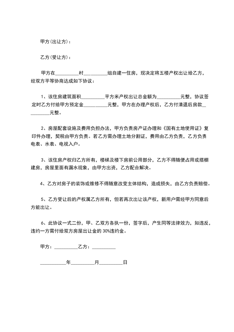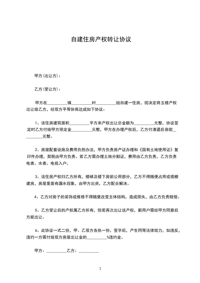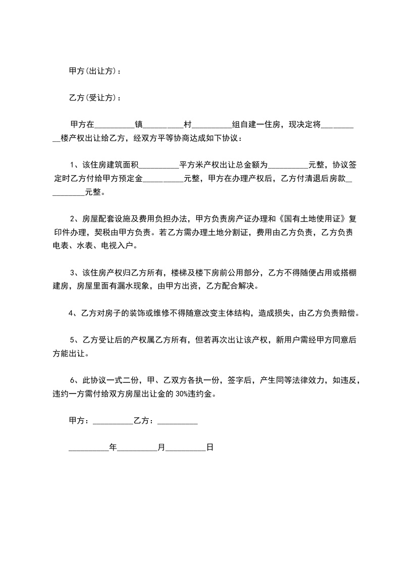 甲方在_________________自建一住房,现决定将__________产权出让给乙方,经双方平等协商达成如下协议: