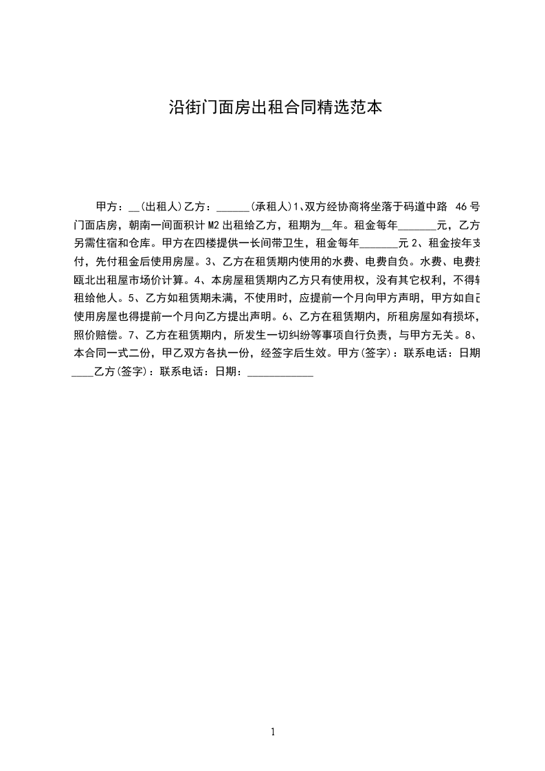 1、双方经协商将坐落于码道中路46号门面店房,朝南一间面积计M2出租给乙方,租期为__年。租金每年_______元,乙方另需住宿和仓库。甲方在四楼提供一长间带卫生,租金每年_______元