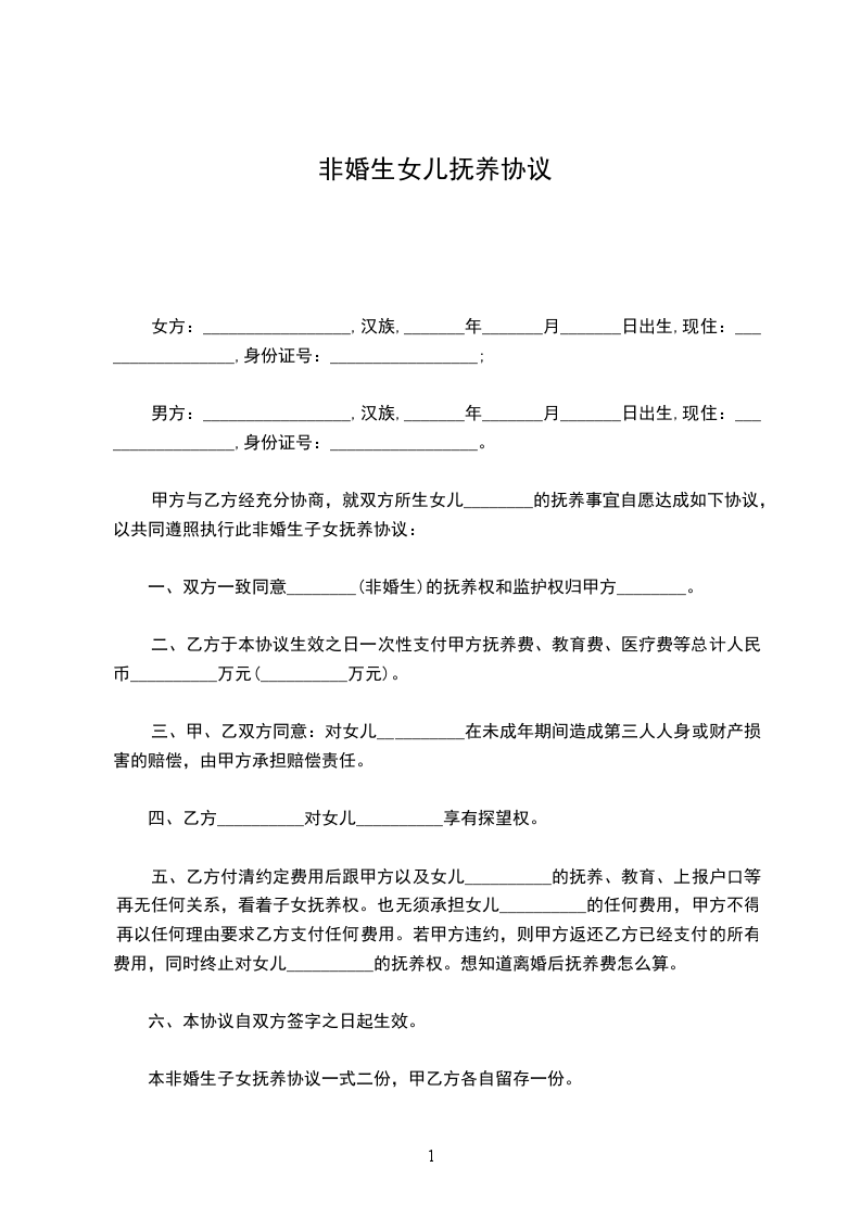 甲方与乙方经充分协商,就双方所生女儿________的抚养事宜自愿达成如下协议,以共同遵照执行此非婚生子女抚养协议: