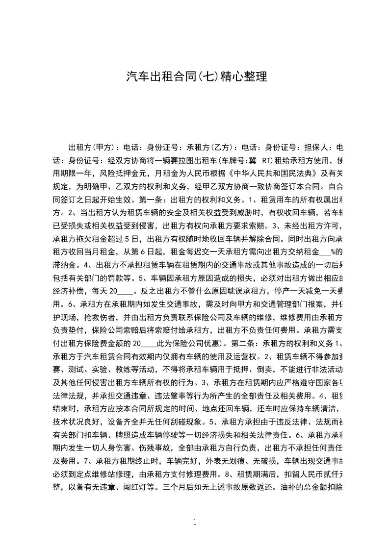 经双方协商将一辆赛拉图出租车(车牌号:冀RT)租给承租方使用,使用期限一年,风险抵押金元,月租金为人民币根据《中华人民共和国民法典》及有关规定,为明确甲、乙双方的权利和义务,经甲乙双方协商一致协商签订本合同。自合同签订之日起开始生效。