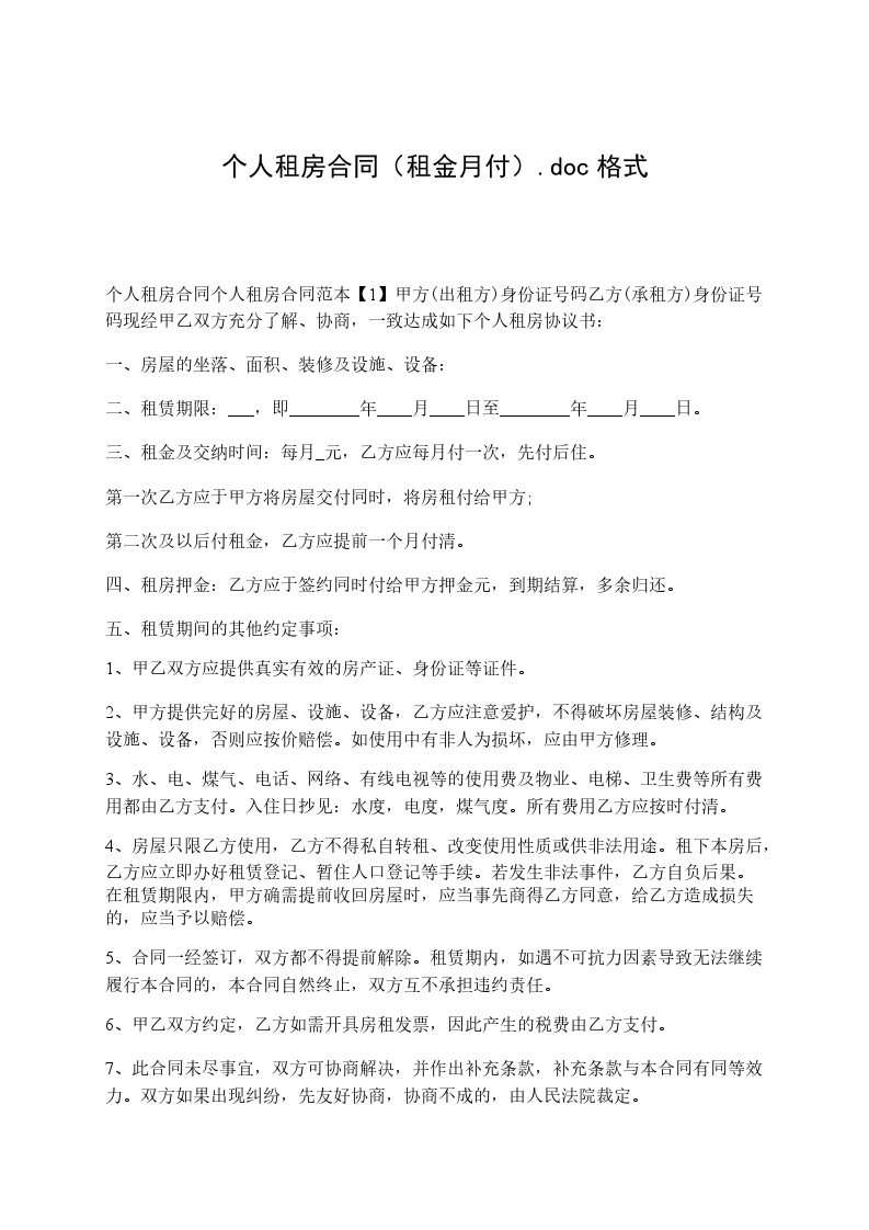 个人租房合同个人租房合同范本【1】甲方(出租方)身份证号码乙方(承租方)身份证号码现经甲乙双方充分了解、协商,一致达成如下个人租房协议书: