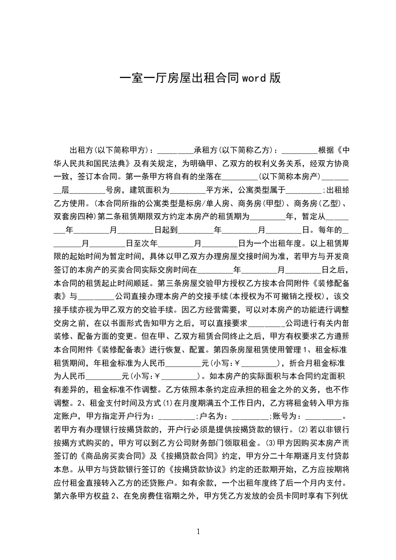 第一条甲方将自有的坐落在_________(以下简称本房产)_________层_________号房,建筑面积为_________平方米,公寓类型属于_________;出租给乙方使用。