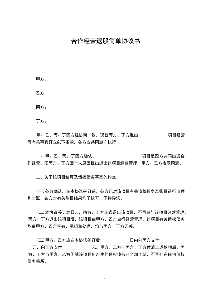 甲、乙、丙、丁四方经协商一致,现就丙方、丁方退出______________项目经营等有关事宜订立以下条款,各方应共同遵守执行: