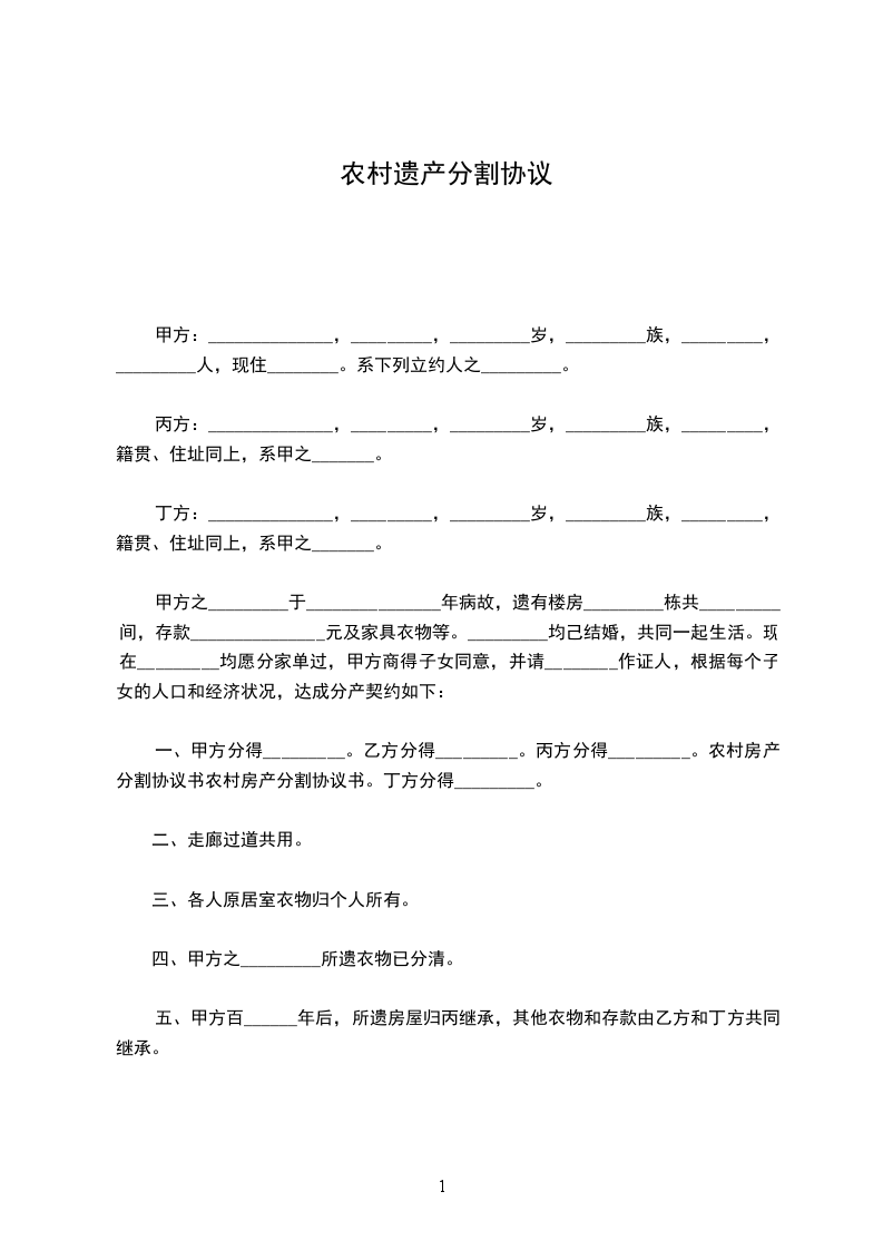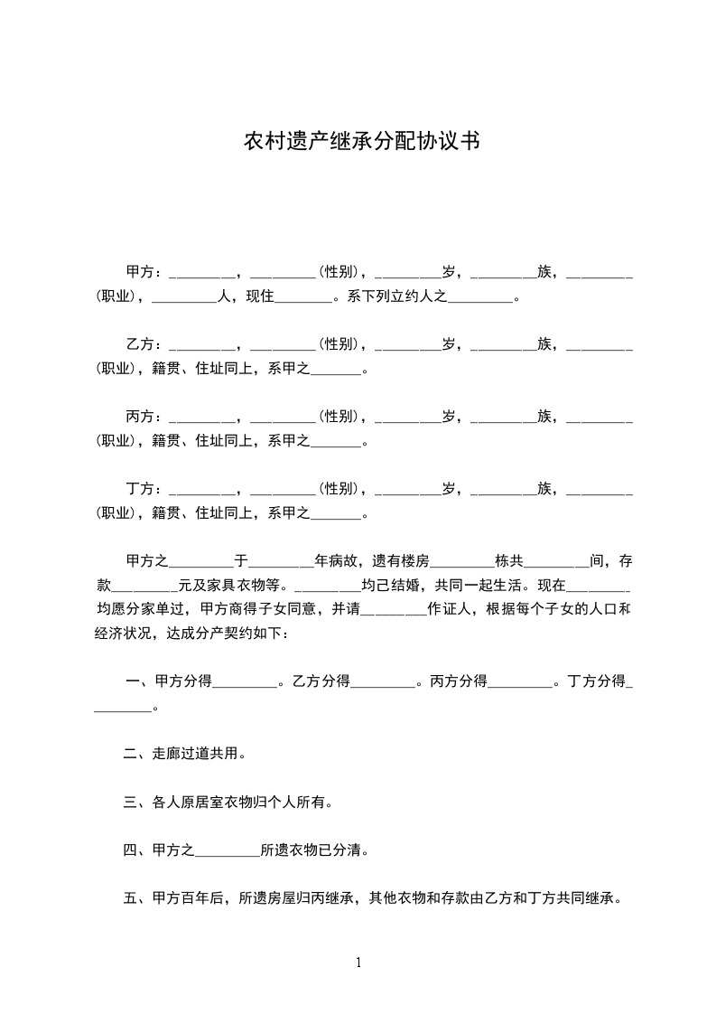 五、甲方百年后,所遗房屋归丙继承,其他衣物和存款由乙方和丁方共同继承。
