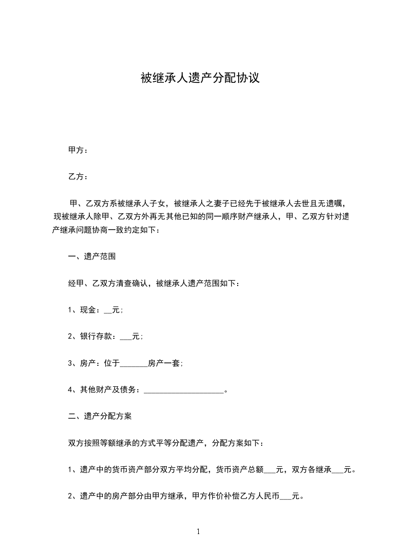 甲方之_________于_________年病故,遗有楼房_________栋共_________间,存款_________元及家具衣物等。_________均己结婚,共同一起生活。现在_________均愿分家单过,甲方商得子女同意,并请_________作证人,根据每个子女的人口和经济状况,达成分产契约如下: