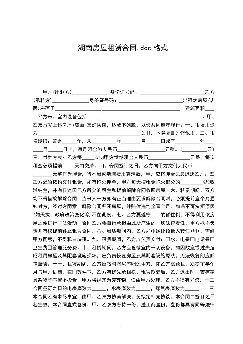 出租之房屋(店面)座落于___________________________________________________。建筑面积______平方米。室内设备包括_______________________________________________。甲、乙双方就上述房屋(店面)友好协商,达成下列款,以资共同遵守履行。