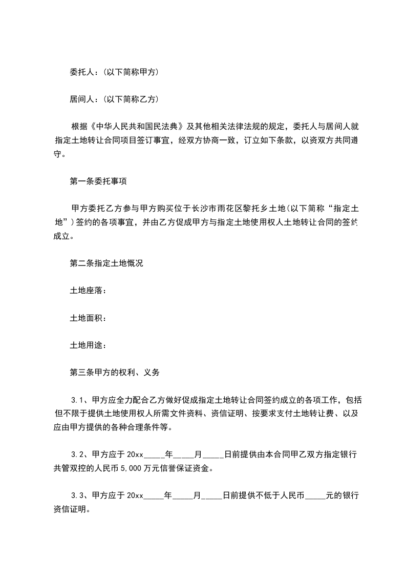根据《中华人民共和国民法典》及其他相关法律法规的规定,委托人与居间人就指定土地转让合同项目签订事宜,经双方协商一致,订立如下条款,以资双方共同遵守。