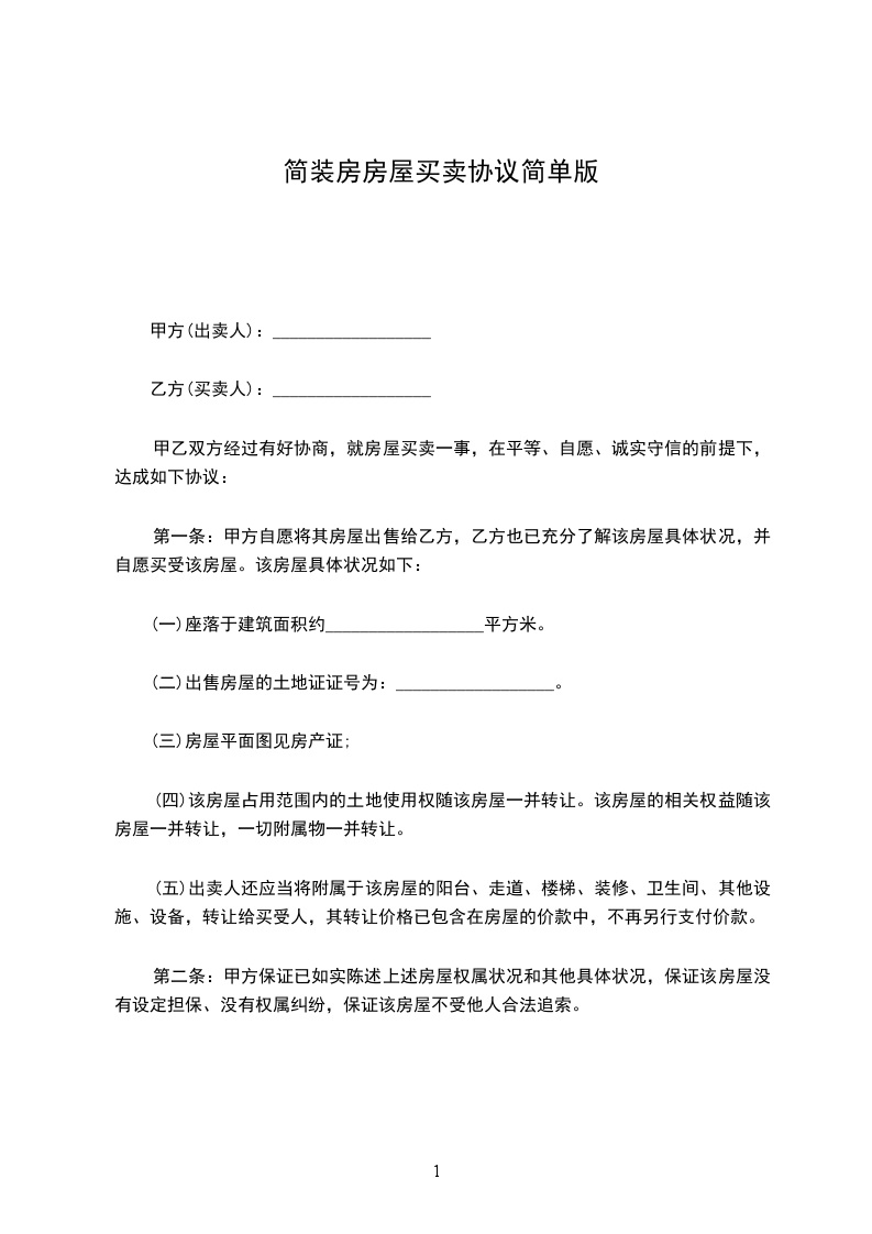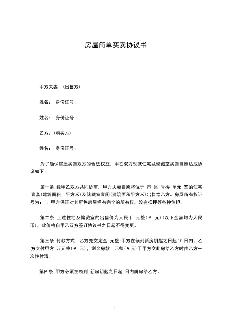 第一条 经甲乙双方共同协商,甲方夫妻自愿将位于 市 区 号楼 单元 室的住宅壹套(建筑面积 平方米)及储藏室壹间(建筑面积平方米)出售给乙方。房屋所有权证号为: 。甲方保证对其所售房屋拥有完全的所有权,没有抵押等各种负担。