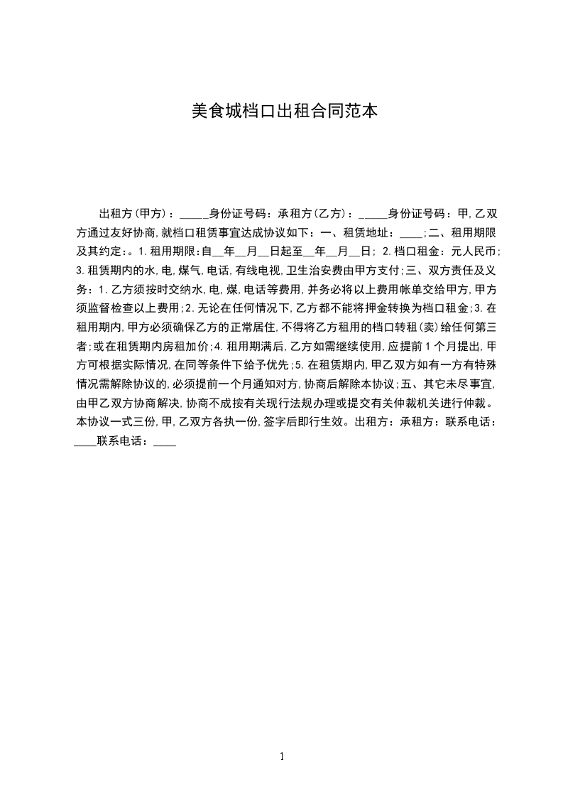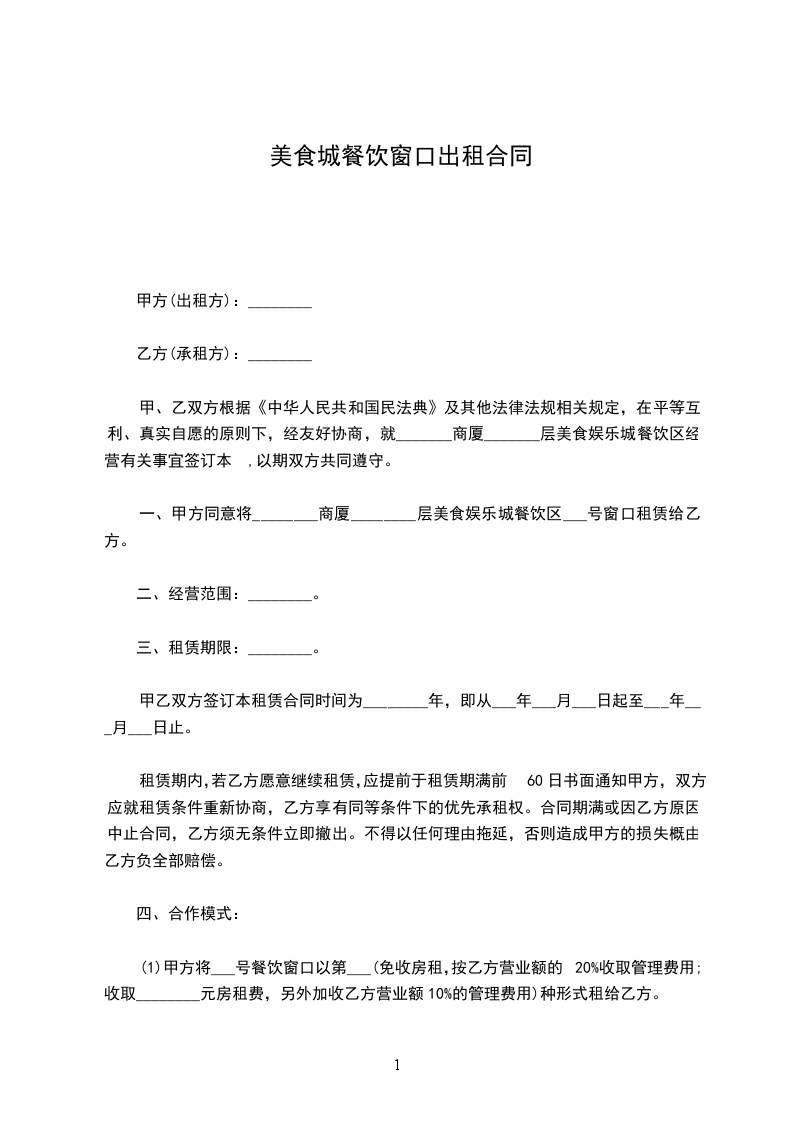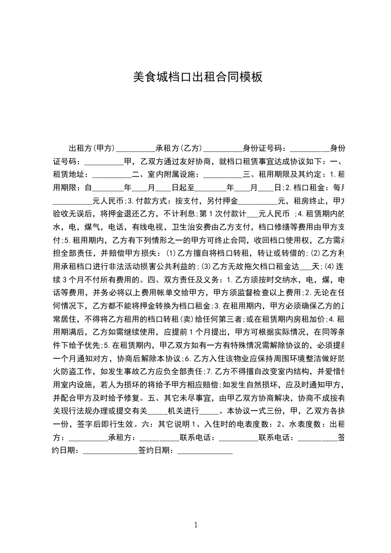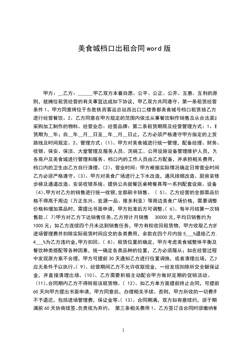 1、香都美食城实行统一收款,甲方每月01日到5日和15日到20____乙方结算销售货款(遇节假日,政府等重大变革方可顺延。)