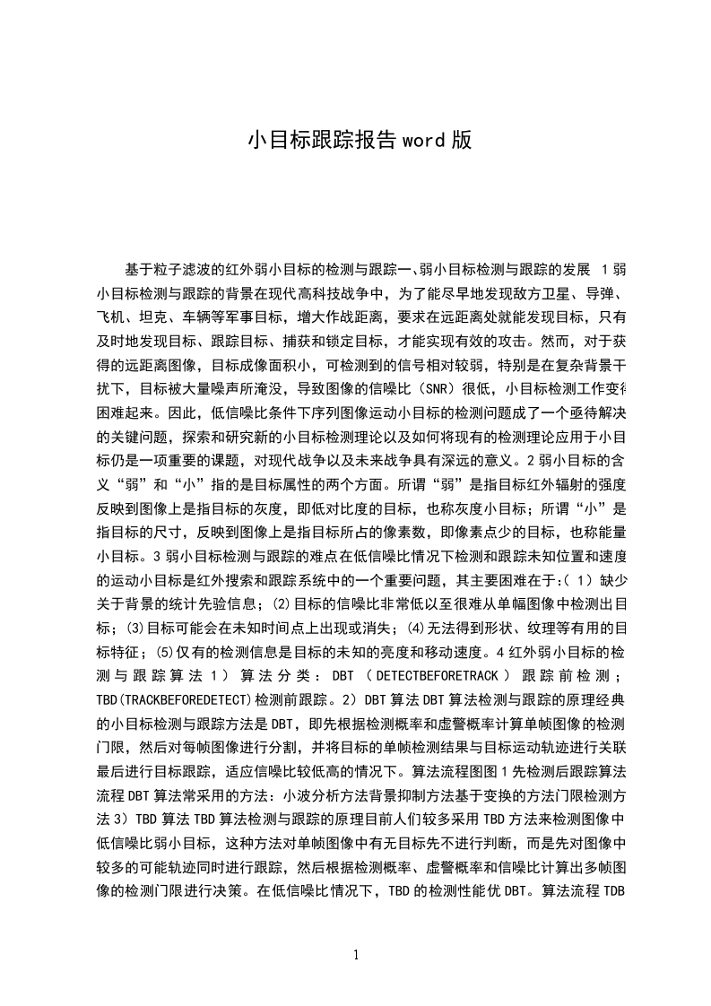 一、弱小目标检测与跟踪的发展1弱小目标检测与跟踪的背景在现代高科技战争中,为了能尽早地发现敌方卫星、导弹、飞机、坦克、车辆等军事目标,增大作战距离,要求在远距离处就能发现目标,只有及时地发现目标、跟踪目标、捕获和锁定目标,才能实现有效的攻击。然而,对于获得的远距离图像,目标成像面积小,可检测到的信号相对较弱,特别是在复杂背景干扰下,目标被大量噪声所淹没,导致图像的信噪比(SNR)很低,小目标检测工作变得困难起来。因此,低信噪比条件下序列图像运动小目标的检测问题成了一个亟待解决的关键问题,探索和研究新的小目标检测理论以及如何将现有的检测理论应用于小目标仍是一项重要的课题,对现代战争以及未来战争具有深远的意义。2弱小目标的含义“弱”和“小”指的是目标属性的两个方面。所谓“弱”是指目标红外辐射的强度,反映到图像上是指目标的灰度,即低对比度的目标,也称灰度小目标;所谓“小”是指目标的尺寸,反映到图像上是指目标所占的像素数,即像素点少的目标,也称能量小目标。3弱小目标检测与跟踪的难点在低信噪比情况下检测和跟踪未知位置和速度的运动小目标是红外搜索和跟踪系统中的一个重要问题,其主要困难在于: