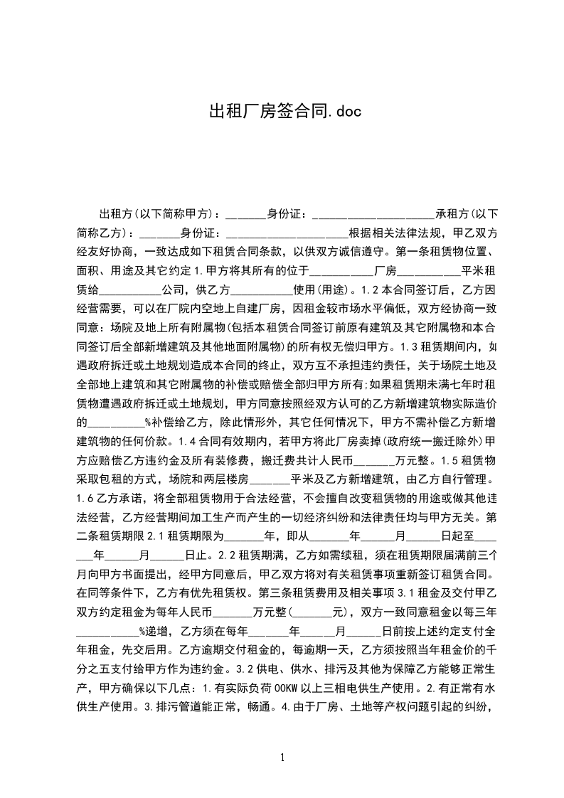 根据国家有关规定,甲、乙双方在自愿、平等、互利的基础上就甲方将其合法拥有的厂房出租给乙方使用的有关事宜,双方达成协议并签定合同如下: