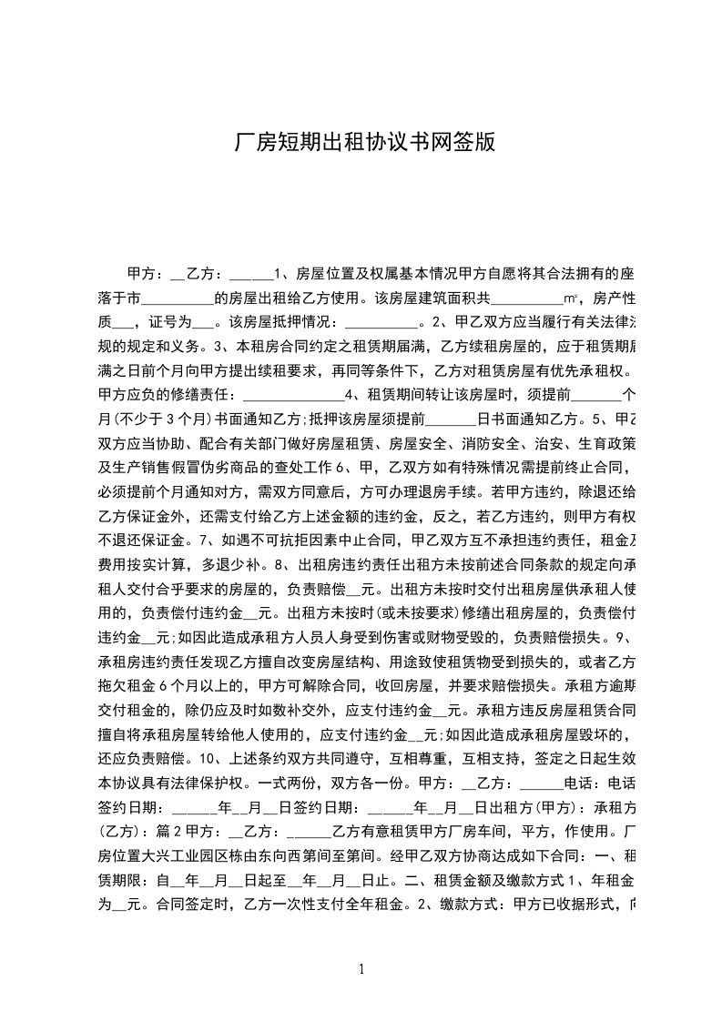 1、甲、乙双方约定,该厂房租赁每日每平方米建筑面积租金为人民币___元。月租金为人民币___元,年租金为___元。