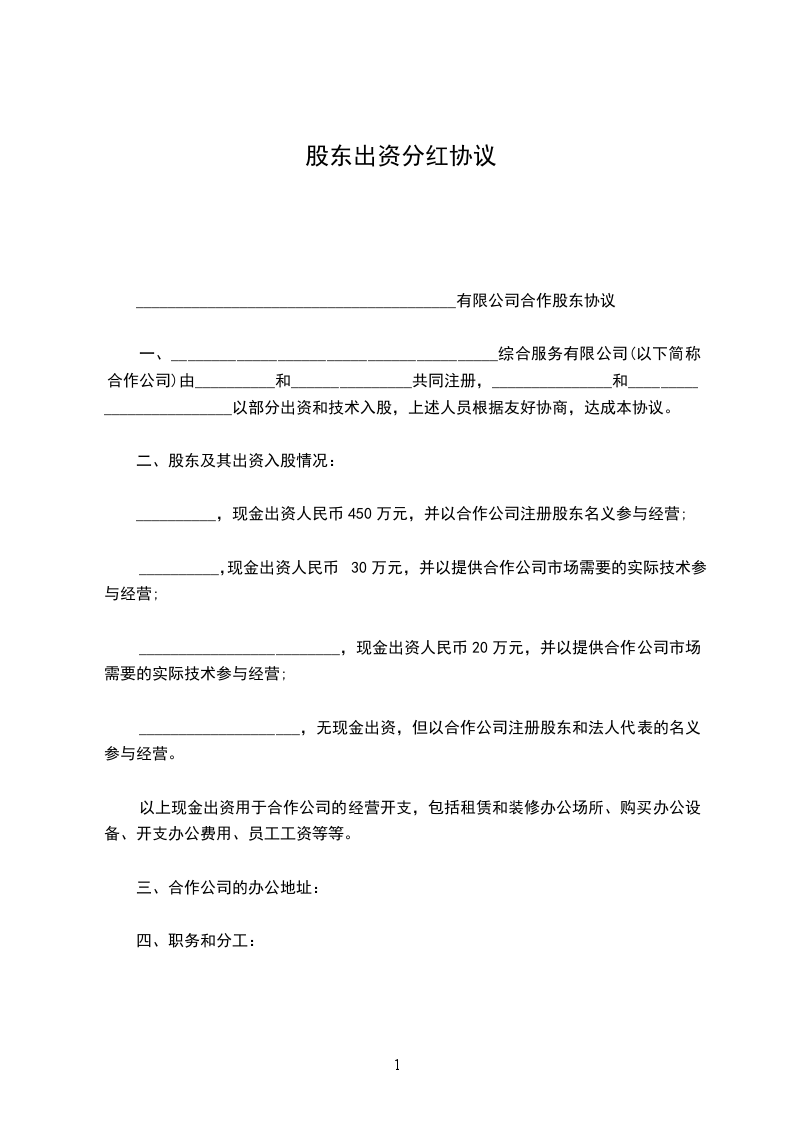 一、________________________________________综合服务有限公司(以下简称合作公司)由__________和_______________共同注册,_______________和_________________________以部分出资和技术入股,上述人员根据友好协商,达成本协议。