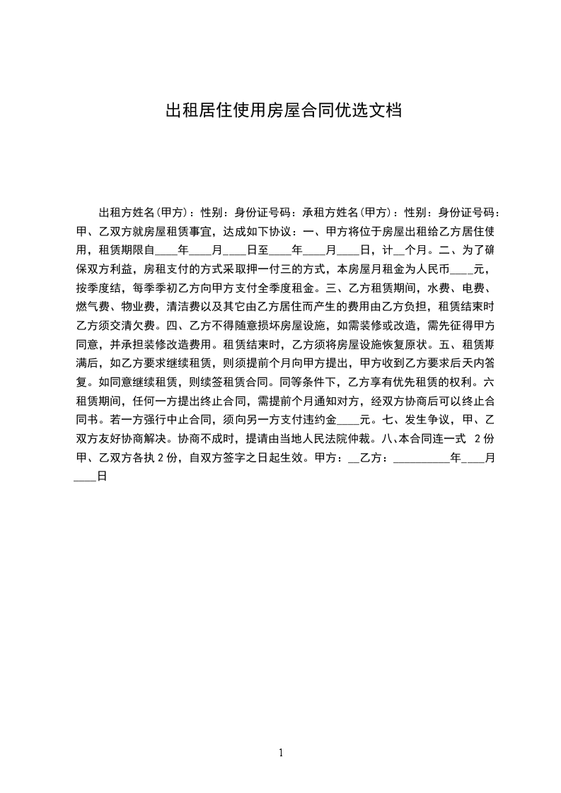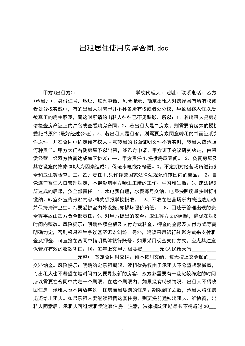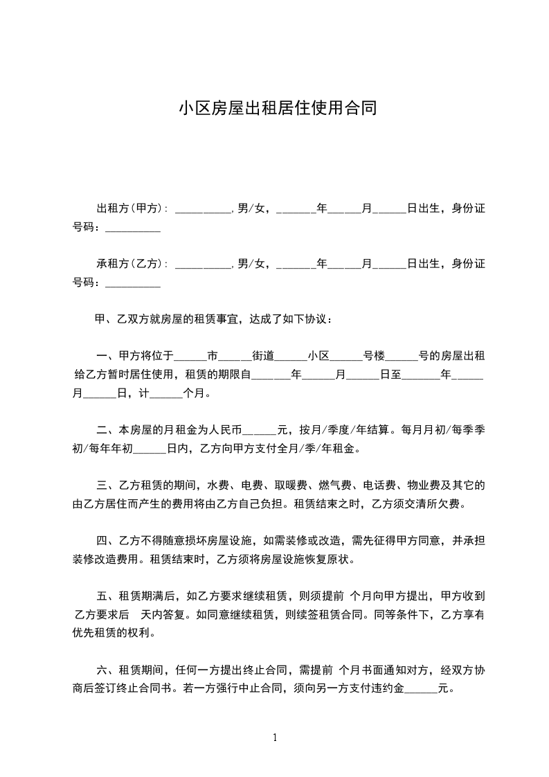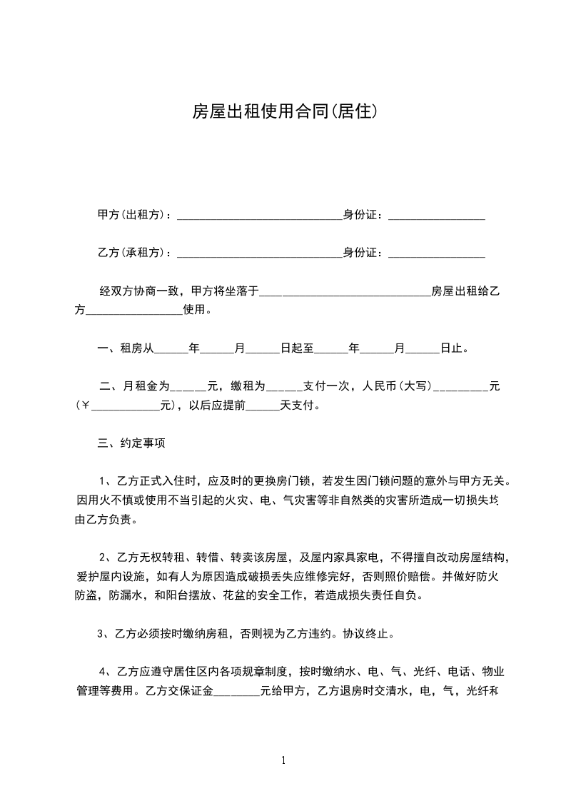 一、甲方将位于房屋出租给乙方居住使用,租赁期限自____年____月____日至____年____月____日,计__个月。