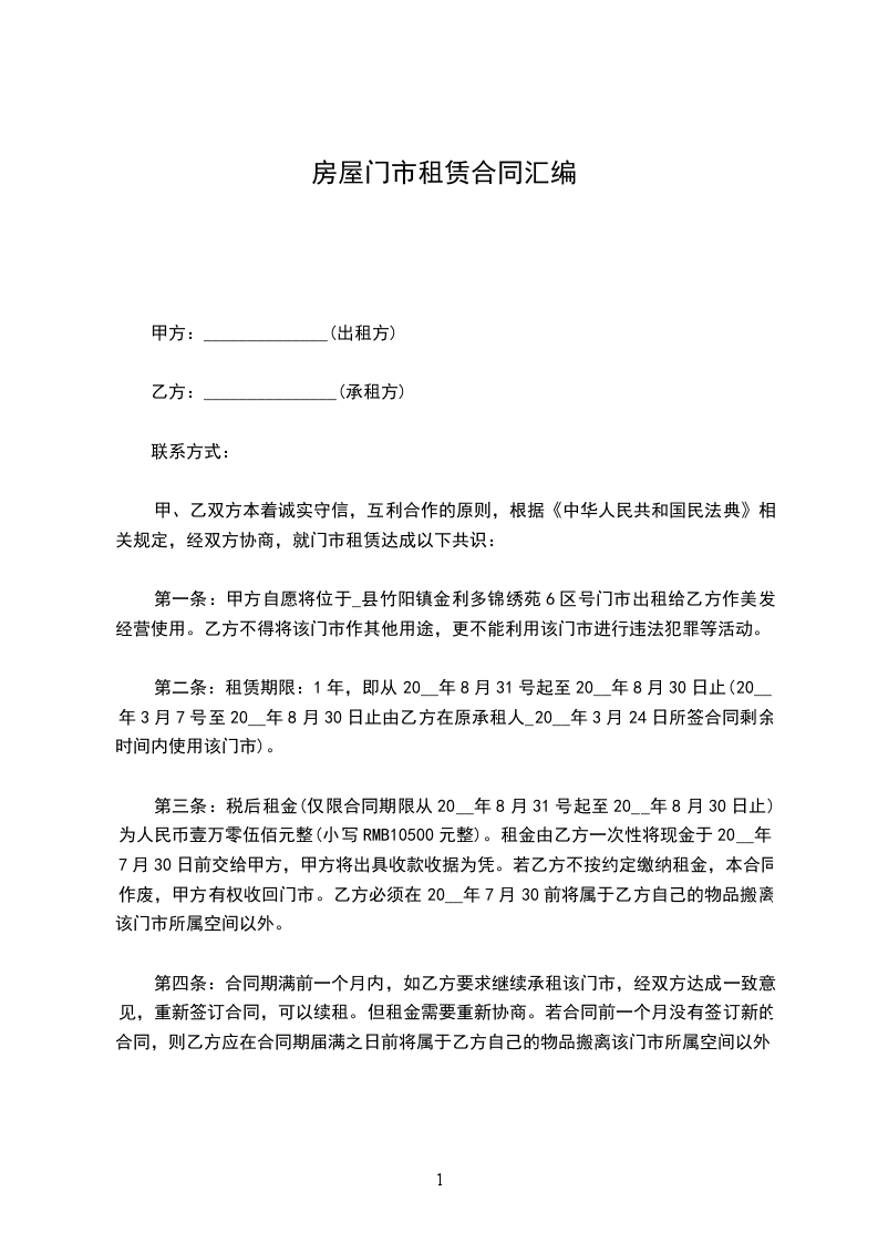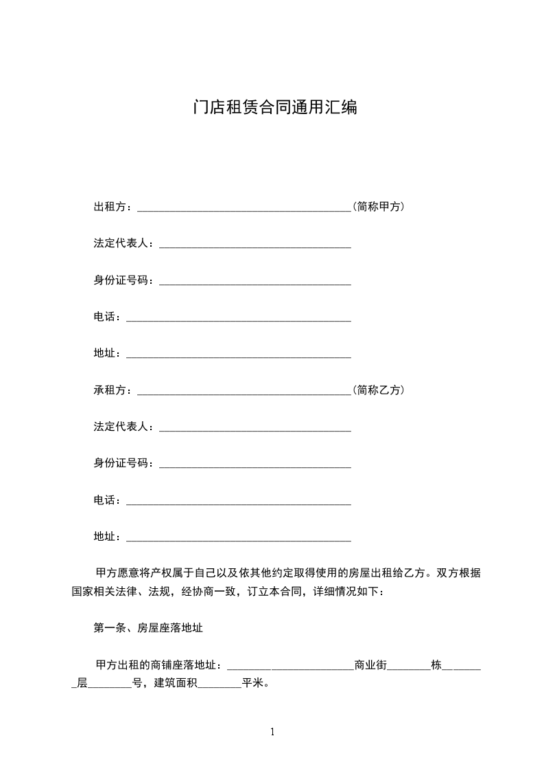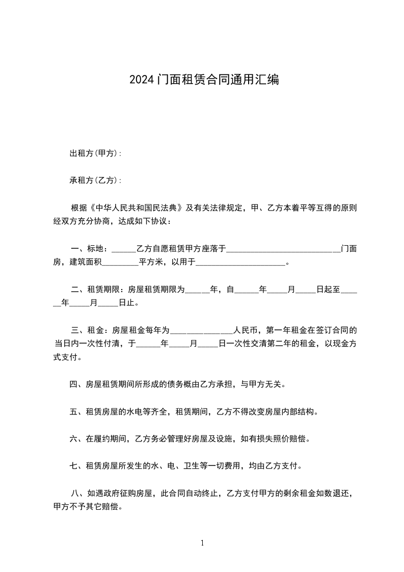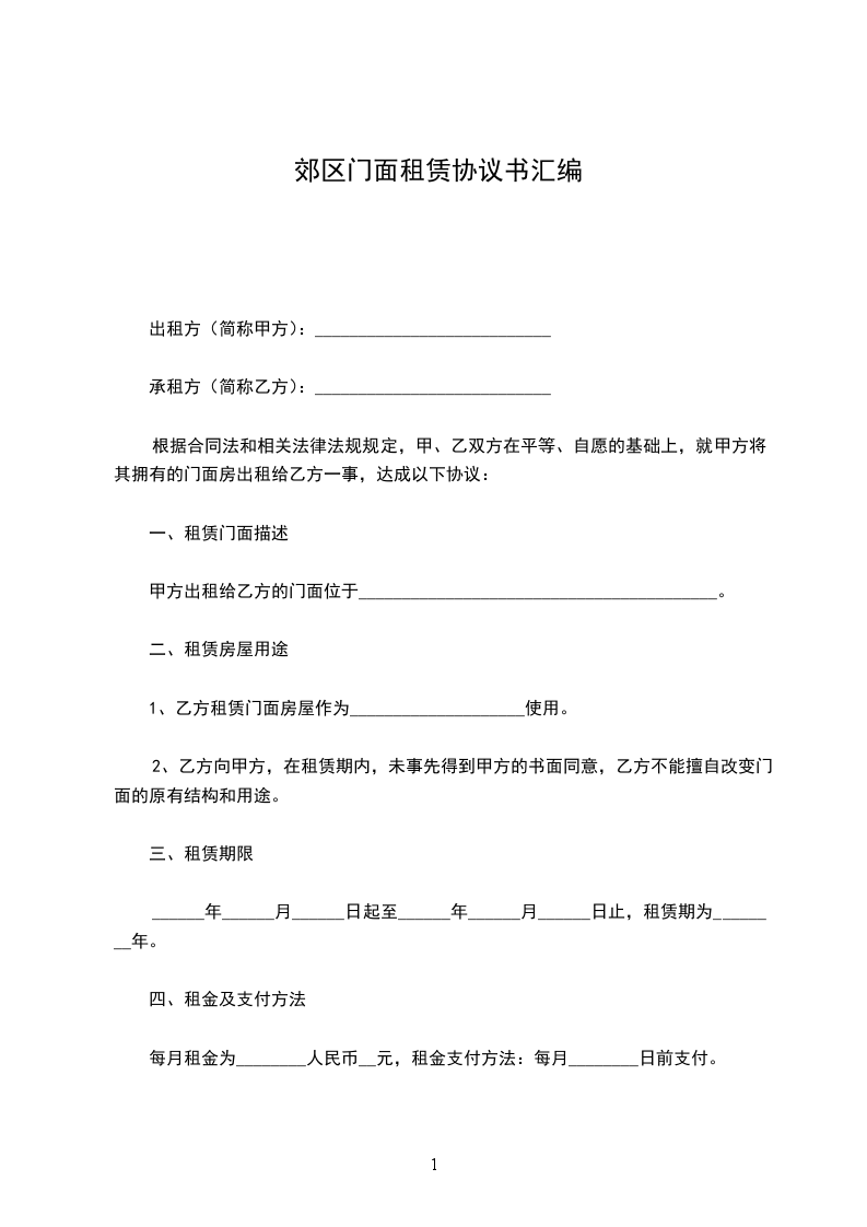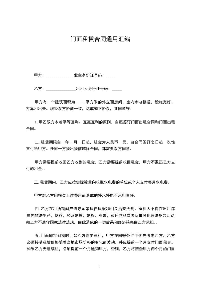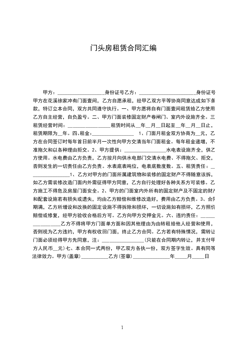 四、租金:_________________1、门面月租金双方协商为__元,乙方在合同签订时每年首日前半月一次性向甲方交清当年门面租金。每年租金递增,不准拖欠和以各种理由拒交。