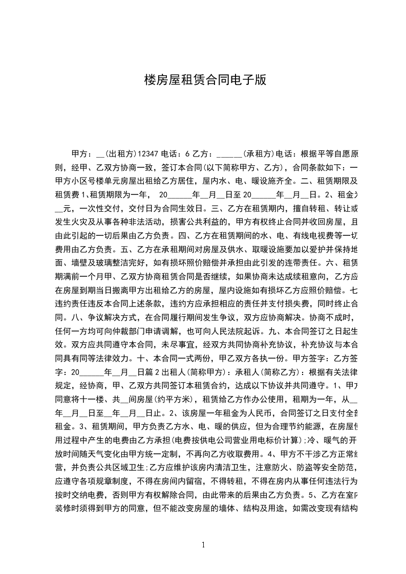 甲方:__(出租方)12347电话:6乙方:______(承租方)电话: