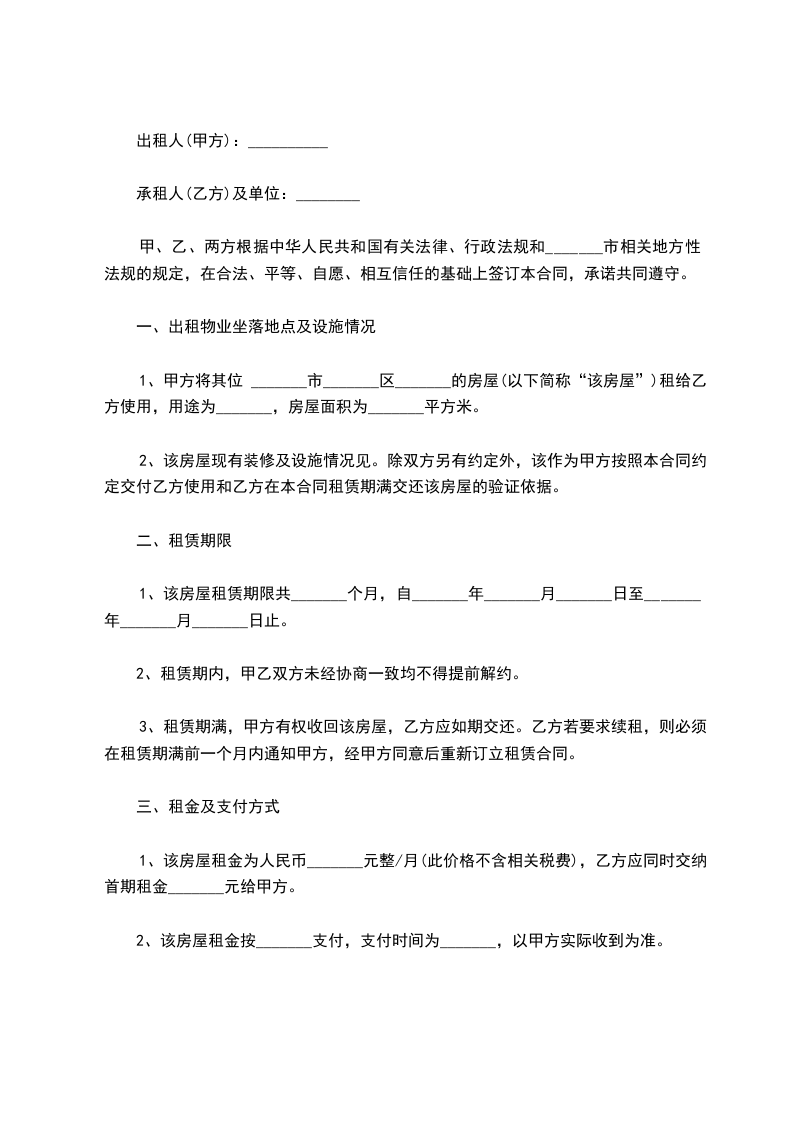 2、甲方出租给乙方的房屋租赁期共_________个月。自____________年______月______日起至____________年______月______日止。乙方向甲方承诺,租赁该房屋仅作为居住使用。租赁期满,甲方有权收回出租房屋,乙方应如期交还。乙方如要求续租,则必须在租赁期满_________个月之前书面通知甲方,经甲方同意后,重新签订租赁合同。