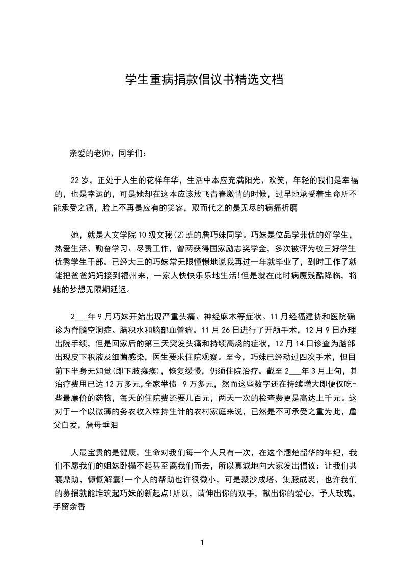 郝需婷,女,22岁,巴彦淖尔人,于2___年9月份入学,现就读于内蒙古民族大学农学院13级农业资源与环境班,是一个学习成绩优异、积极热情的学生。然而就是这样一个善良乐观的女孩儿,在2___年11月12日被诊查出患有急性髓系白血病,这个消息对于一个怀揣着青春美好梦想的她来说无疑是晴天霹雳。在自己12岁的时候,郝需婷的父母就离异了,这也给她幼小的心灵带来了巨大的创伤,她承受着同龄孩子本不该承受的压力,父母离异后,她跟随父亲生活。父亲是乌拉特前旗客运汽车的一名普通司机,每个月只有20_____多元的收入,而继母没有工作,全家只凭父亲的工资来维持生计。不断地吃药,不断的治疗,使一个本不富裕的家庭走向绝境。