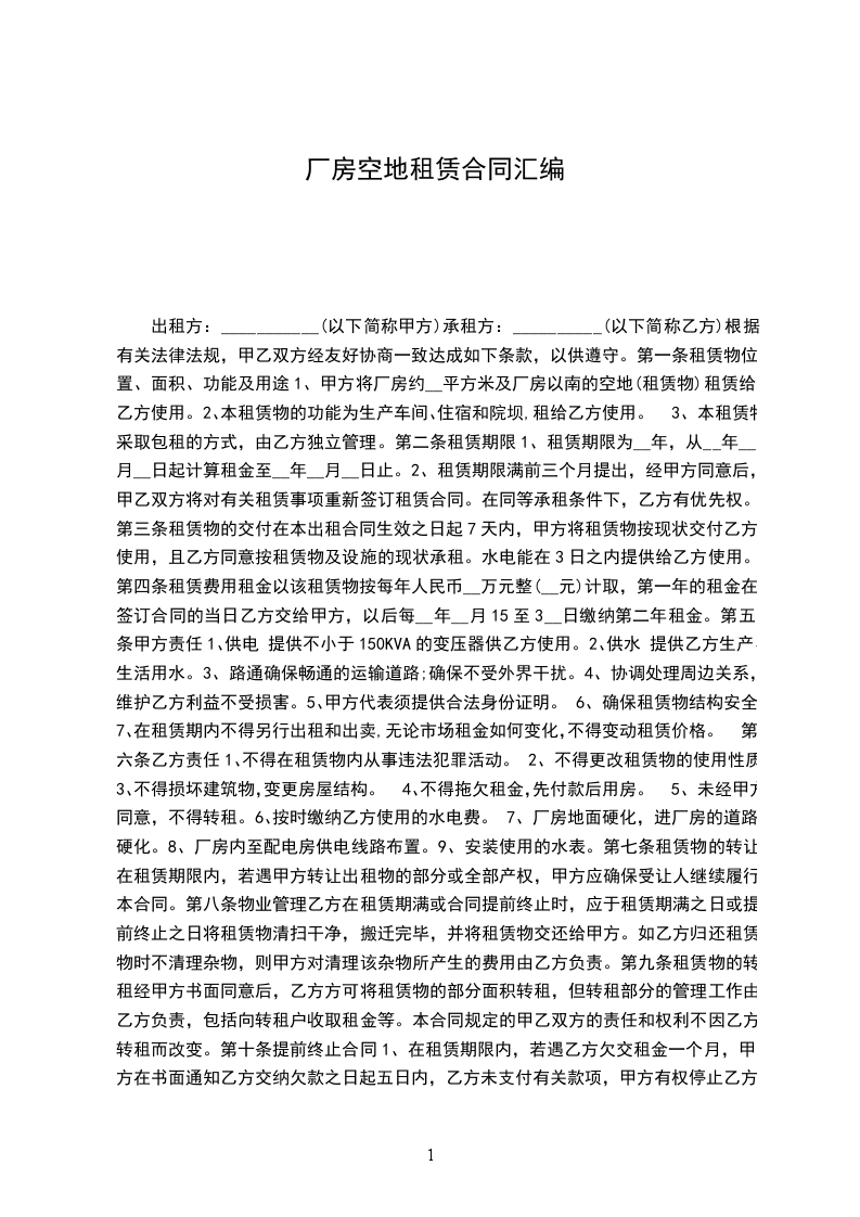 1、甲方将厂房约__平方米及厂房以南的空地(租赁物)租赁给乙方使用。