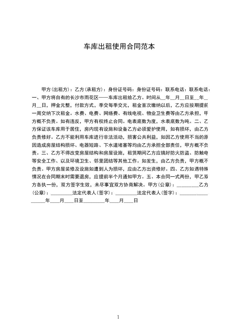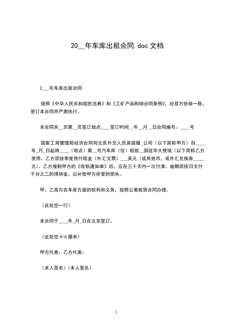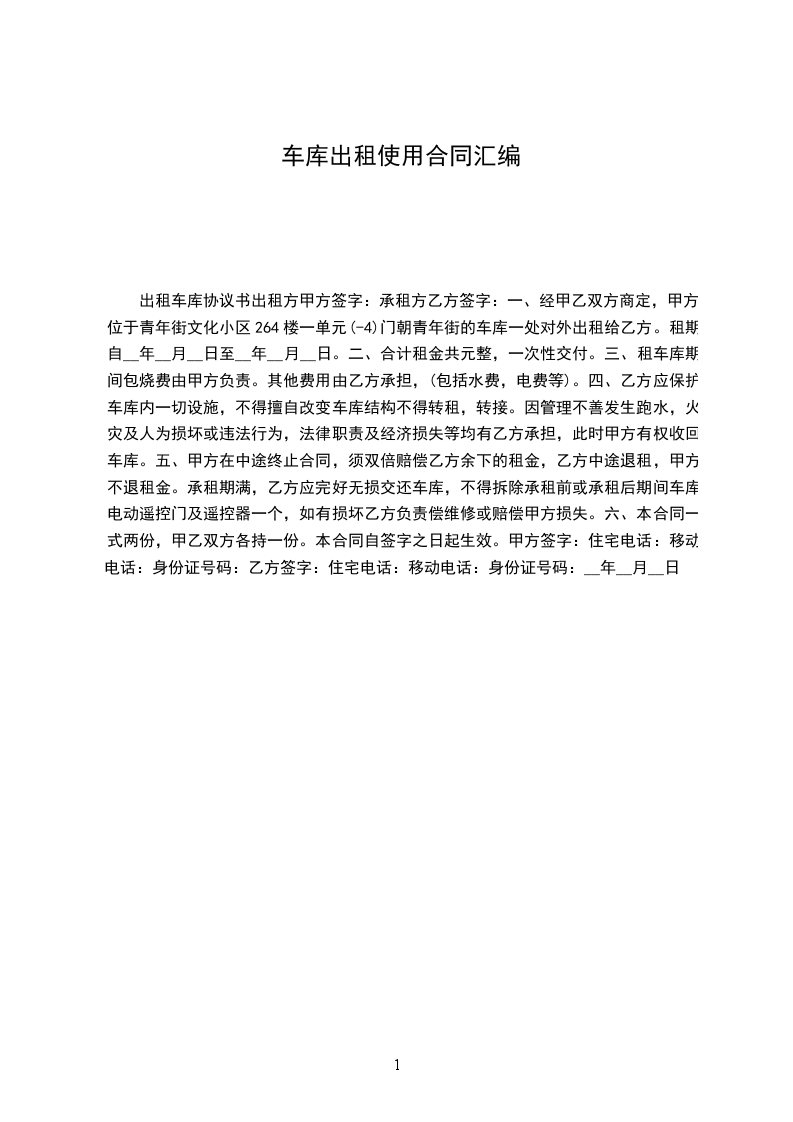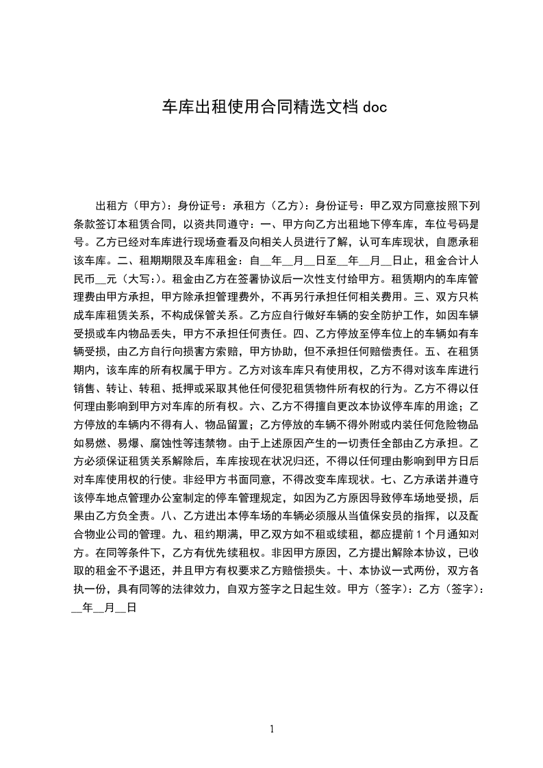 二、租期期限及车库租金:自__年__月__日至__年__月__日止,租金合计人民币__元(大写:)。租金由乙方在签署协议后一次性支付给甲方。租赁期内的车库管理费由甲方承担,甲方除承担管理费外,不再另行承担任何相关费用。