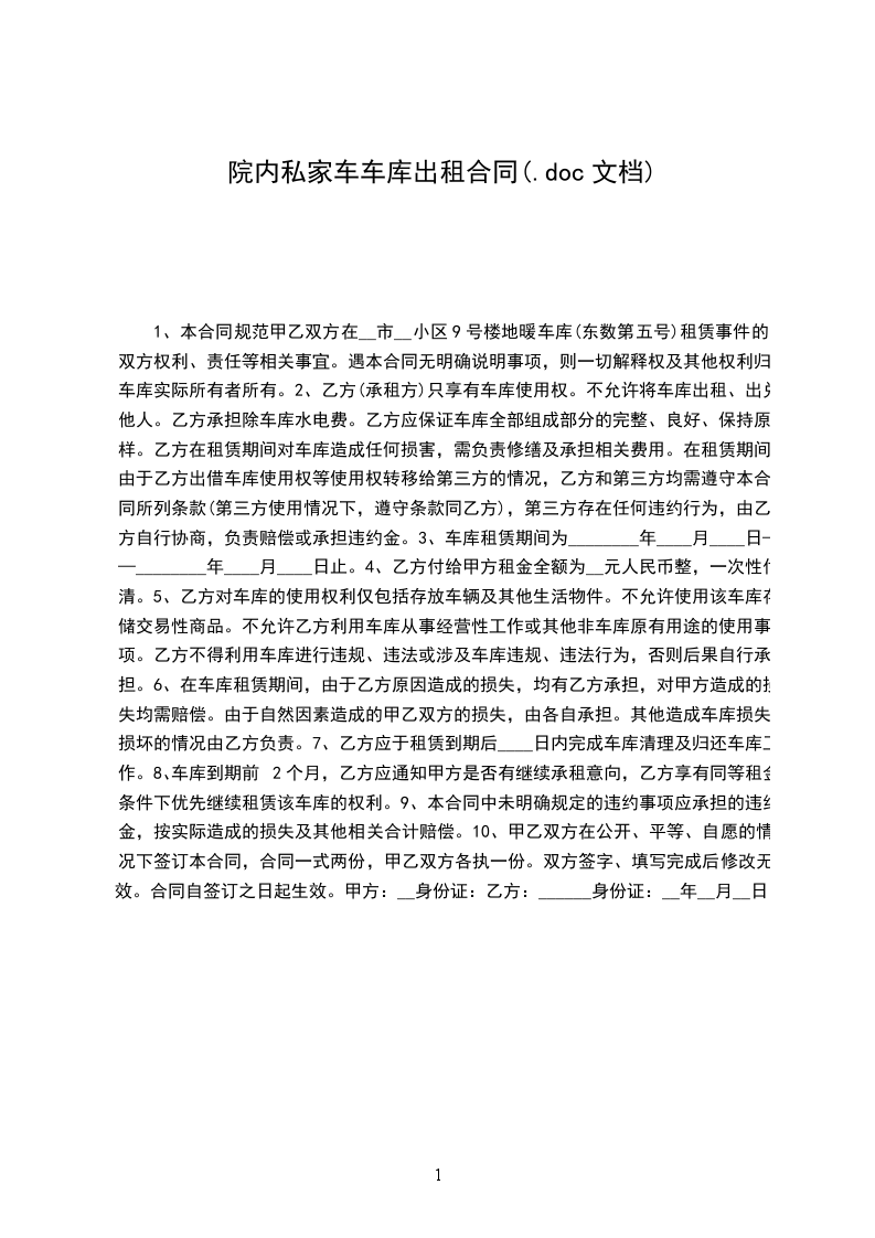 一、甲方向乙方出租地下停车库,车位号码是号。乙方已经对车库进行现场查看及向相关人员进行了解,认可车库现状,自愿承租该车库。