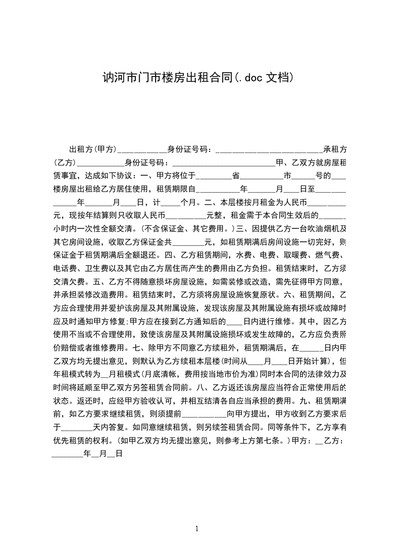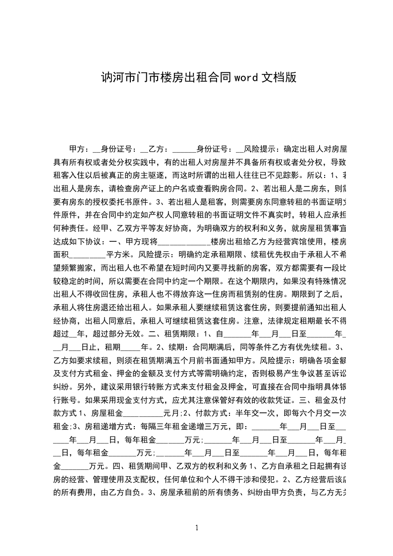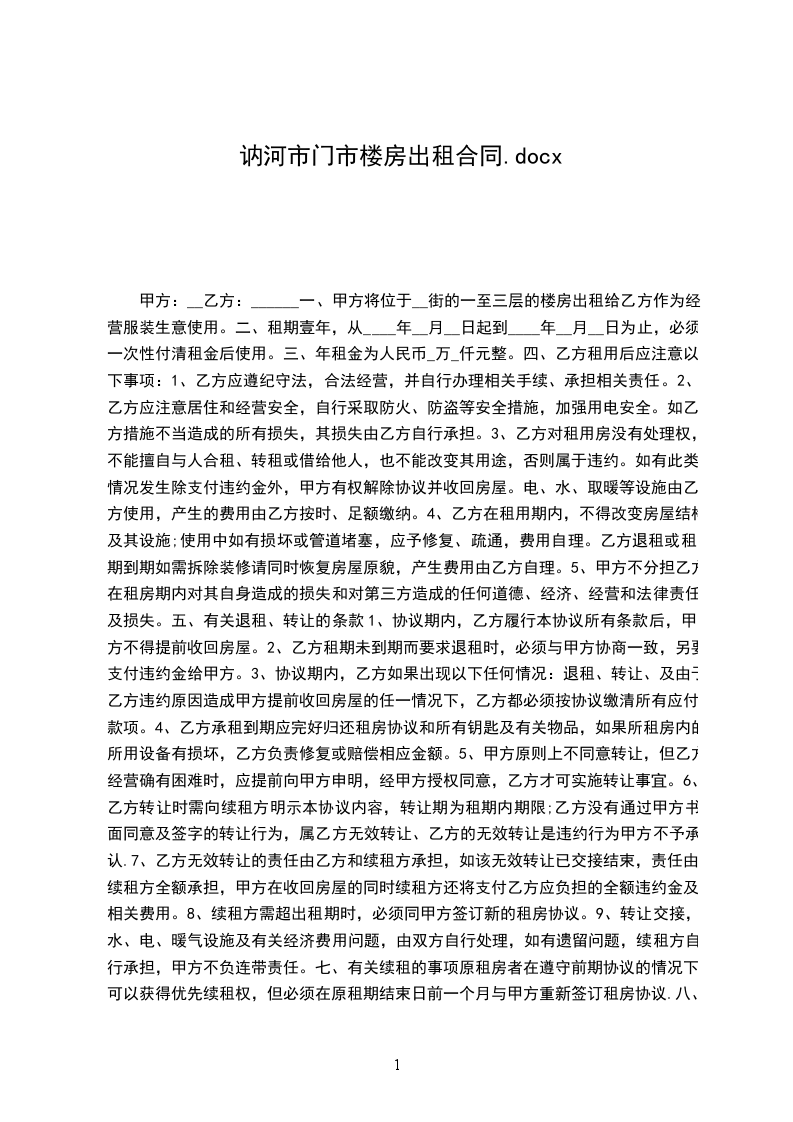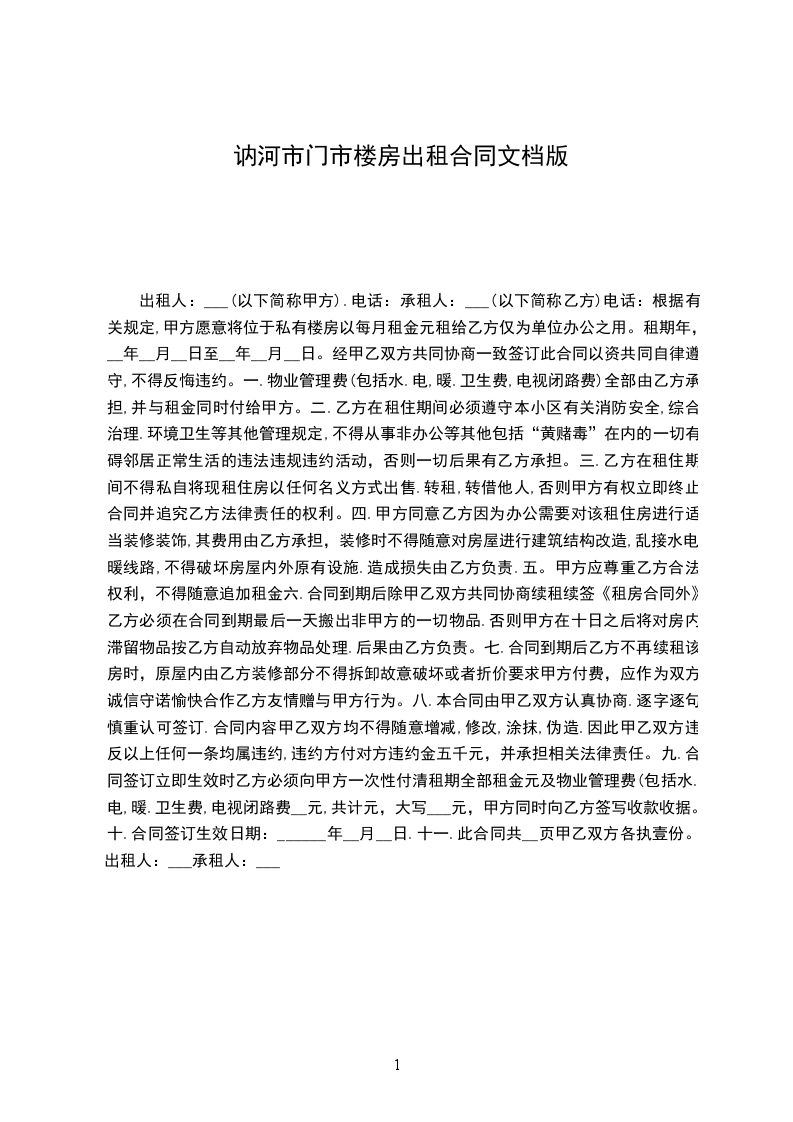根据《民法典》有关规定,甲方愿意将位于________________的私有楼房以每月租金元租给乙方仅为单位办公之用。租期年,________年____月____日至________年____月____日。经甲乙双方共同协商一致签订此合同以资共同自律遵守,不得反悔违约。