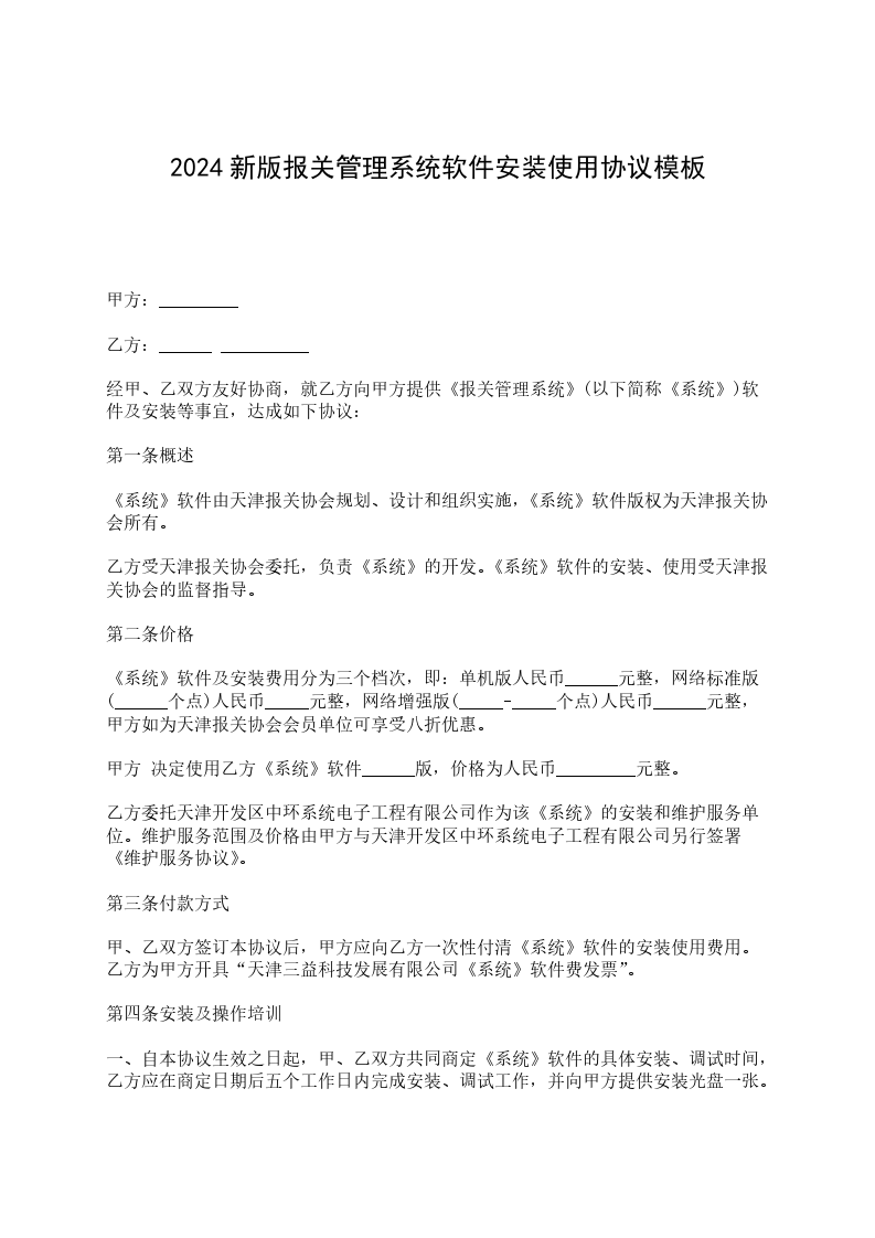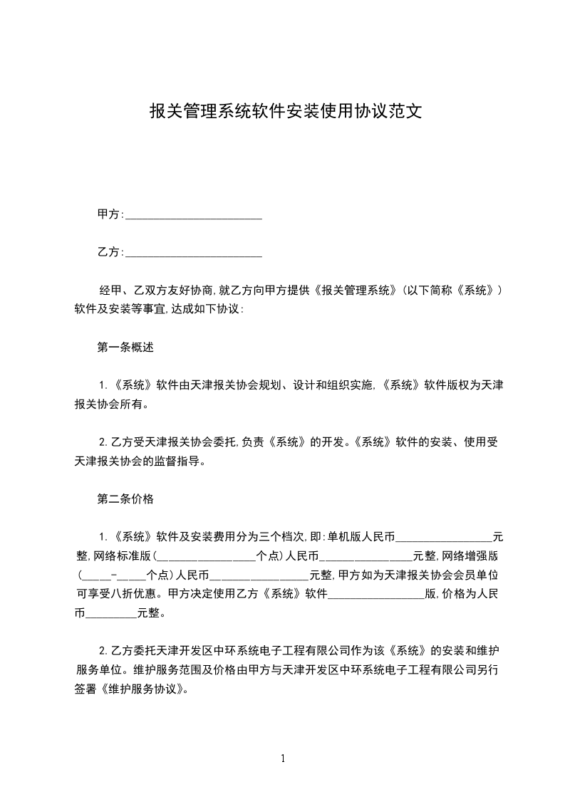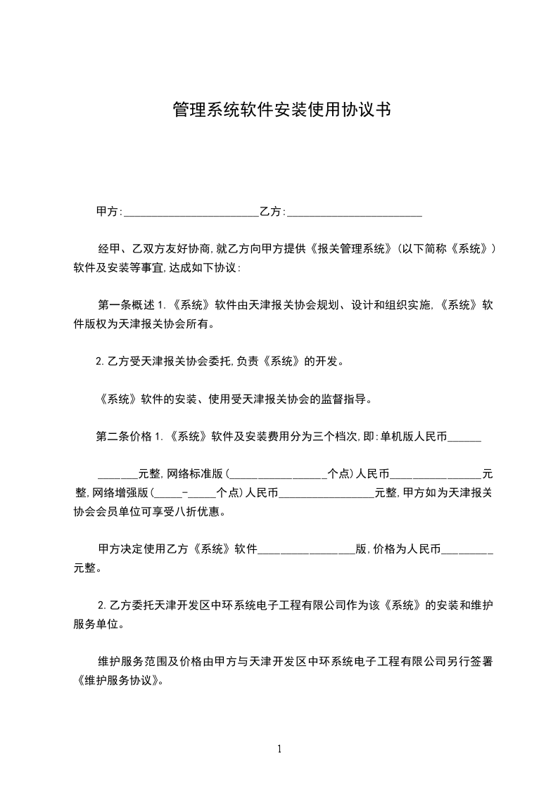 1.《系统》软件及安装费用分为三个档次,即:单机版人民币_________________元整,网络标准版(_________________个点)人民币________________元整,网络增强版(_____-_____个点)人民币_________________元整,甲方如为天津报关协会会员单位可享受八折优惠。甲方决定使用乙方《系统》软件_________________版,价格为人民币_________元整。
