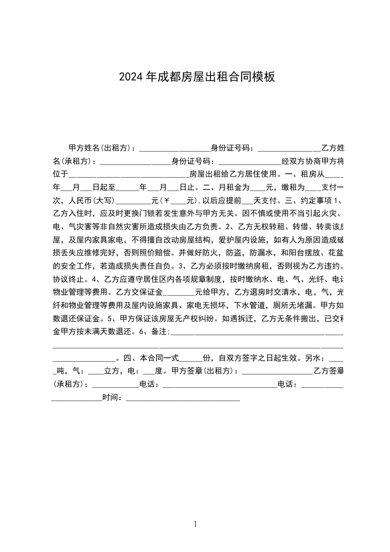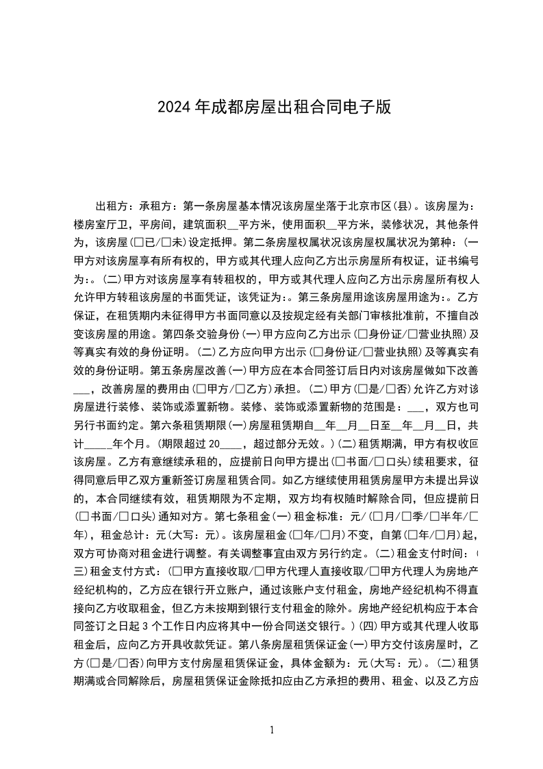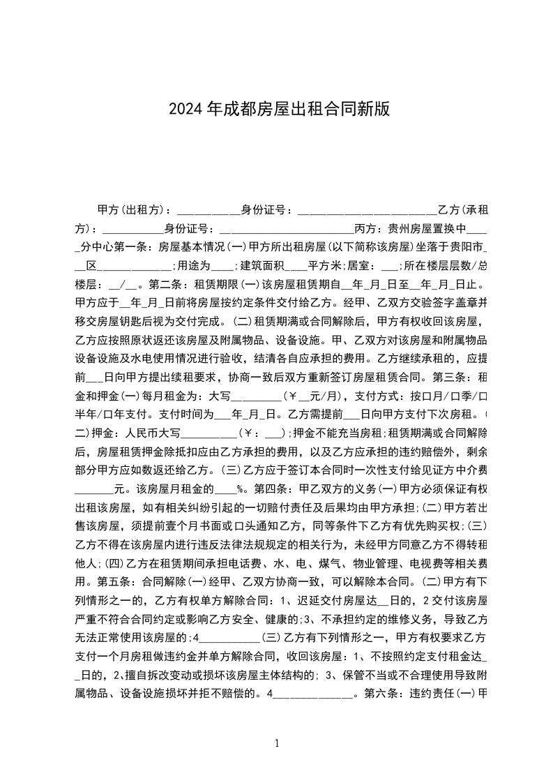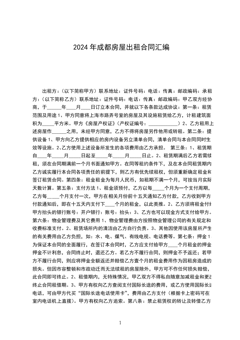 1、为保证本合同的全面履行,在签订本合同时,乙方应支付给甲方____个月租金的押金,押金不计利息,合同终止时,退还乙方。若乙方不履行合同,则押金不予返还;若甲方不履行合同,则应将押金全额返还并赔偿乙方壹个月的租金费用作为因租房造成的损失。但因市容整顿和市政动迁而无法续租的房屋除外,甲方可不作任何损失赔偿,此合同即可终止。