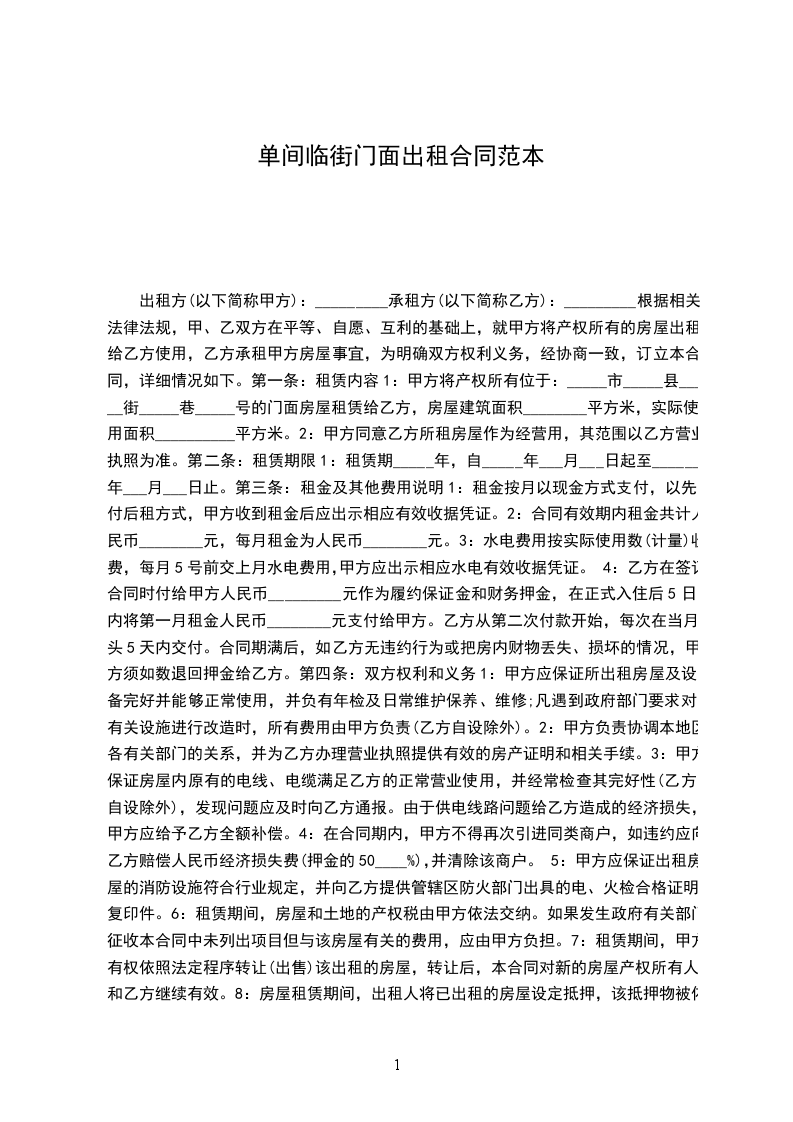 1:甲方将产权所有位于:_____市_____县_____街_____巷_____号的门面房屋租赁给乙方,房屋建筑面积________平方米,实际使用面积__________平方米。